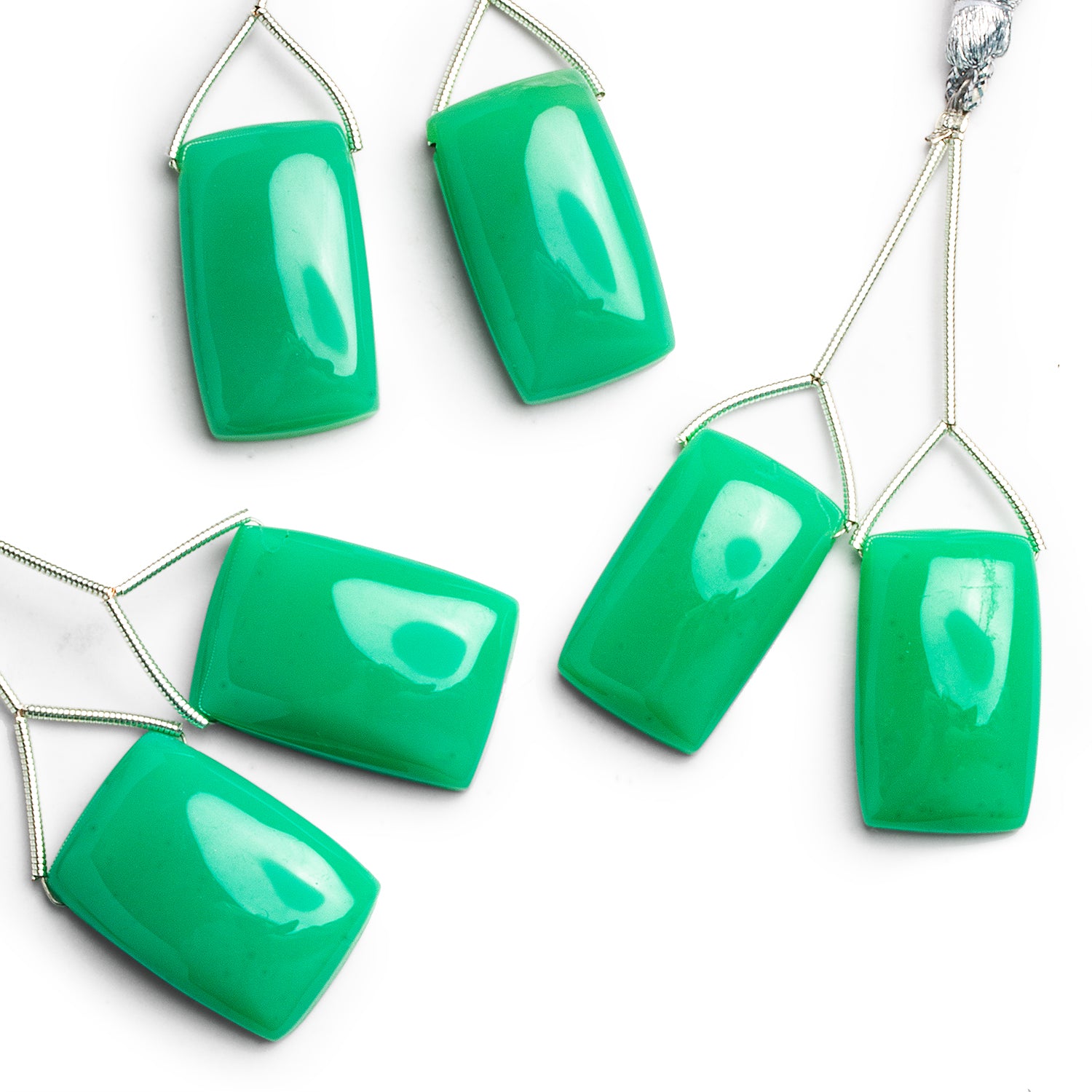 Polished to a silky, mirror-like finish, these Mint Green Chalcedony rectangle focals glow with a cool, luminous transparency that feels both modern and organic. Their fresh, aquatic green tone sits somewhere between jade and sea glass, catching light beautifully across their broad, gently domed faces. Each bead is carefully hand-shaped with softened corners and clean edges, giving them a refined architectural presence while still feeling fluid and natural. Sold as a matched pair, the two pieces are closely aligned in color, depth, and polish—ideal for earrings, a split pendant design, or a balanced centerpiece in a statement necklace.