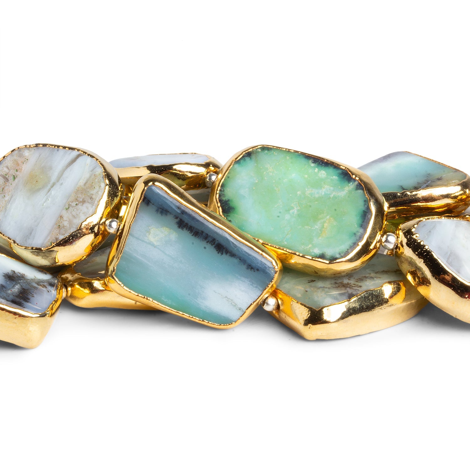 These Gold Leafed Blue Peruvian Opal Nugget Beads are a stunning mix of natural charm and vivid color. Measuring approximately 24x19mm, each freeform nugget is framed in a lustrous gold leaf finish that highlights the vibrant blue-green hues of the Peruvian Opal. The striations and matrix within the stones add extra depth and character, making each bead visually unique.