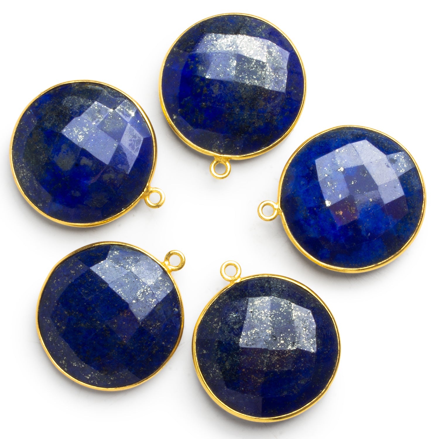 These Vermeil Bezeled Lapis Lazuli Faceted Coin Connectors are sold individually and measure approximately 26mm in diameter. Each pendant features a striking deep blue Lapis Lazuli centerpiece with a subtle faceted surface that enhances its natural shimmer and rich matrix. Flecks of golden pyrite sparkle within the stone, adding dimension and contrast.