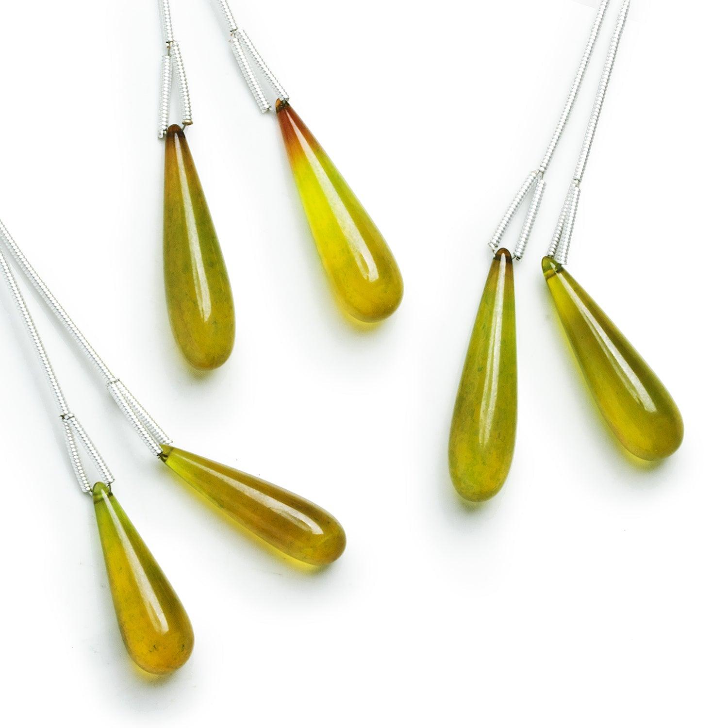 Beads measure about 22x7mm to 29x8mm. Expect a yellowish-green color palette with caramel colors interspersed throughout. Includes a match set of 2 pieces.