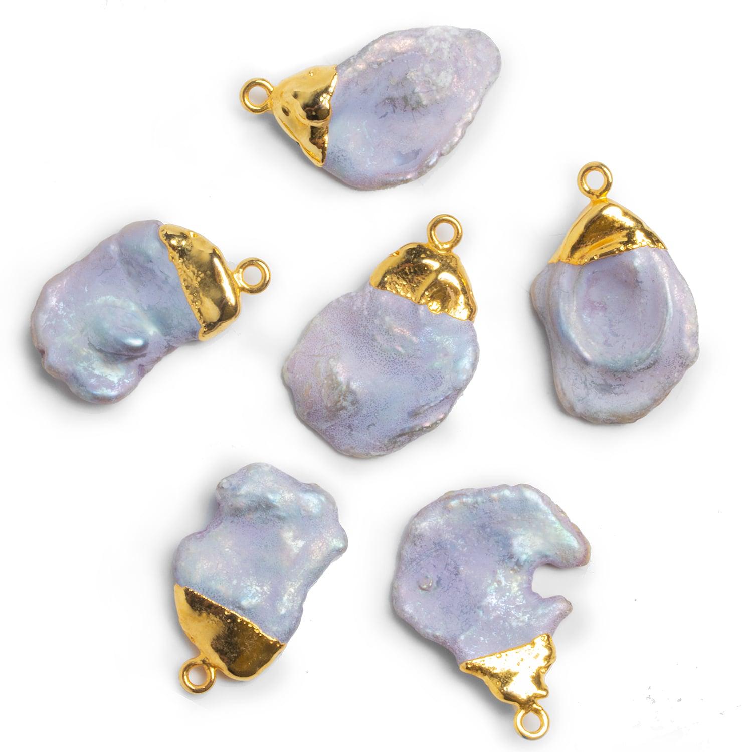 Pendants average about 27x16mm. These pieces feature purplish-pink pearls in irregular nugget shapes topped off with our gorgeous gold leafing. Expect some variation in size and shape.