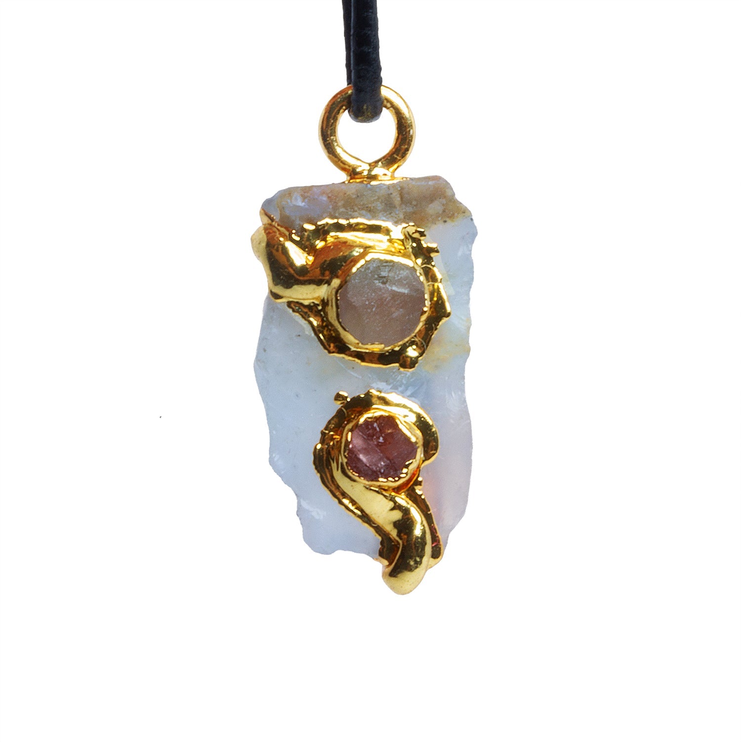 Crafted from soft blue Peruvian Opal and adorned with two glowing Rubies, this pendant offers a refined yet raw expression of natural beauty. Both rubies are encased in gleaming gold leaf, forming a flowing design that feels organic and elemental.