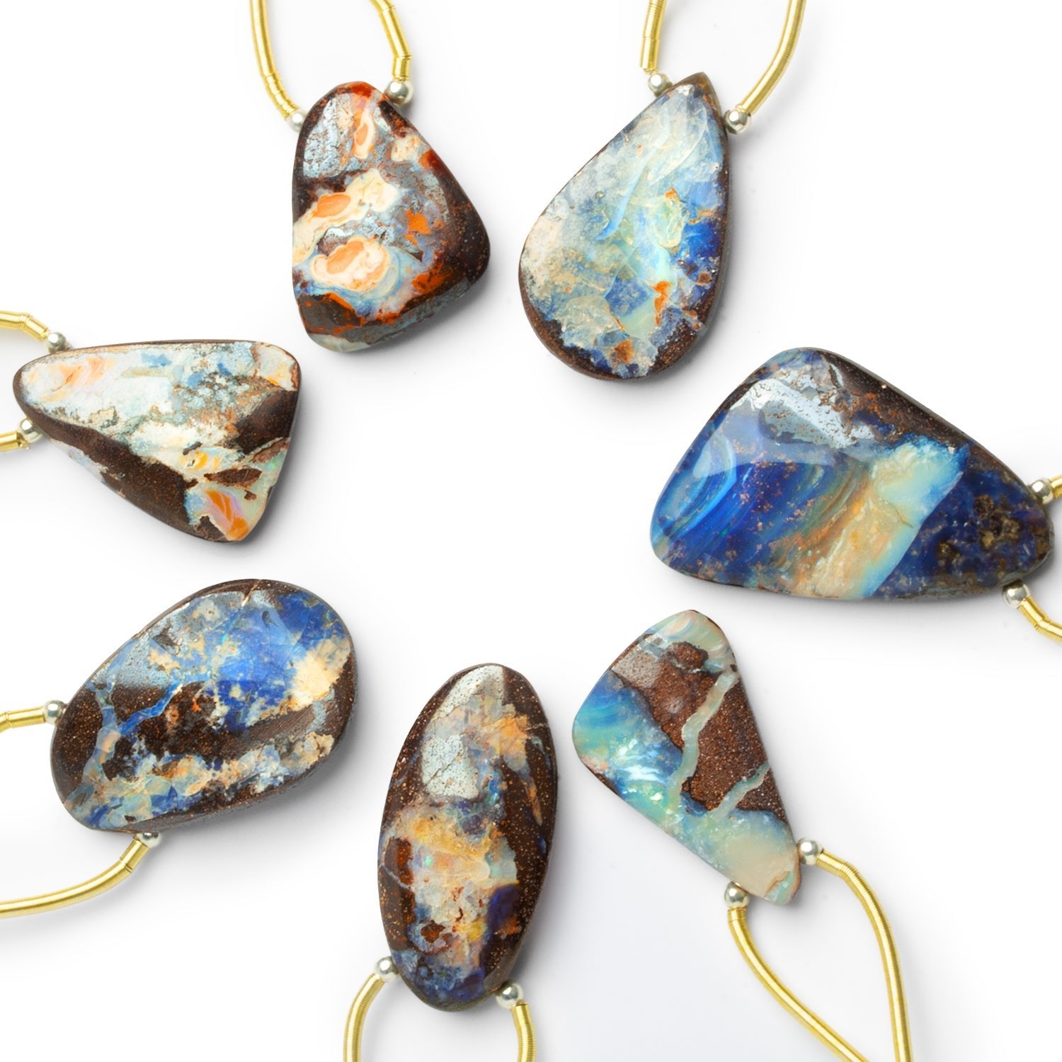 These Australian Boulder Opal Nugget Focal Beads average 28x17mm and dazzle with high-contrast palettes of indigo blue, coppery brown, and streaks of fiery orange or milky green. Each bead features a unique top-drilled silhouette—from teardrops to abstract shields—highlighting the natural diversity of opalization patterns.