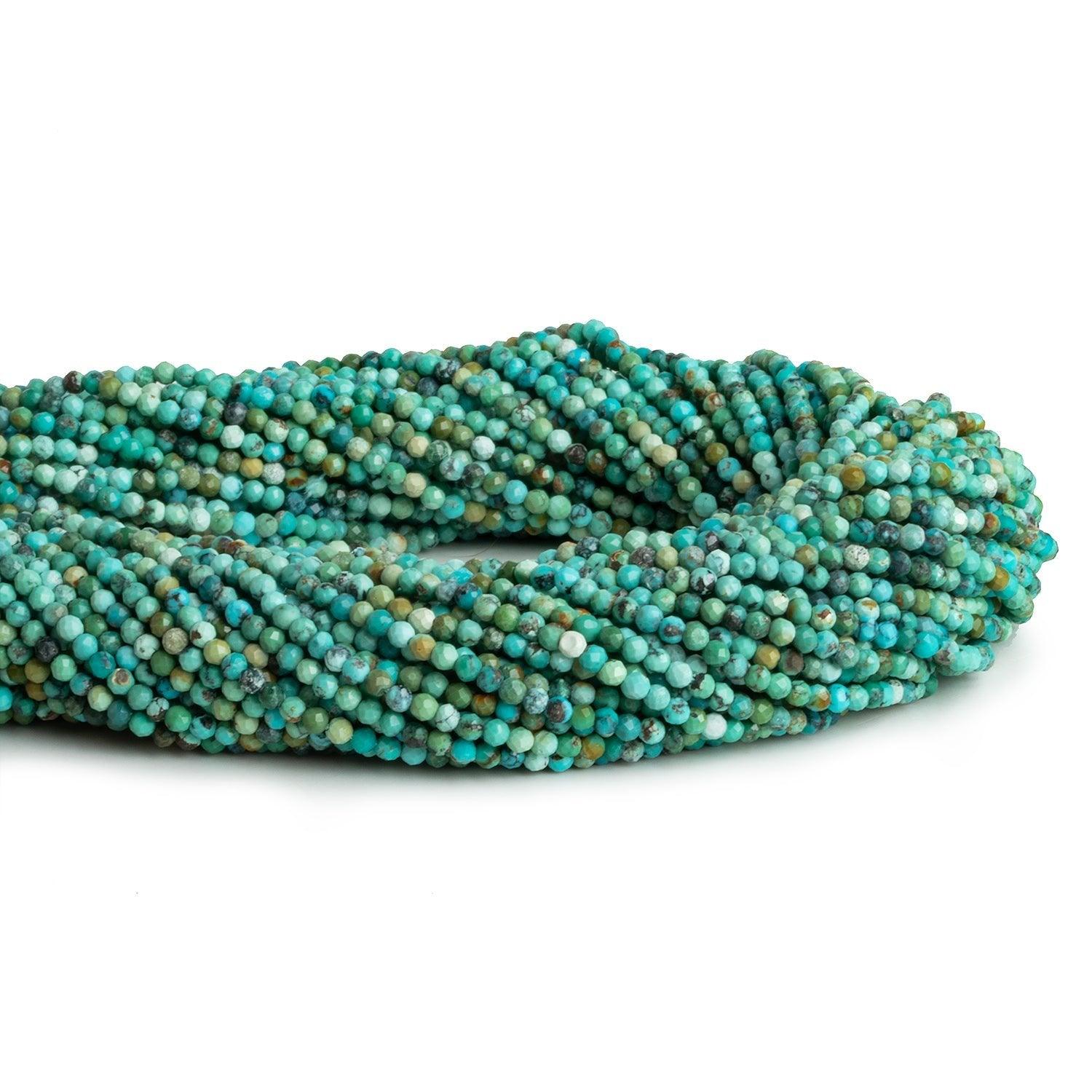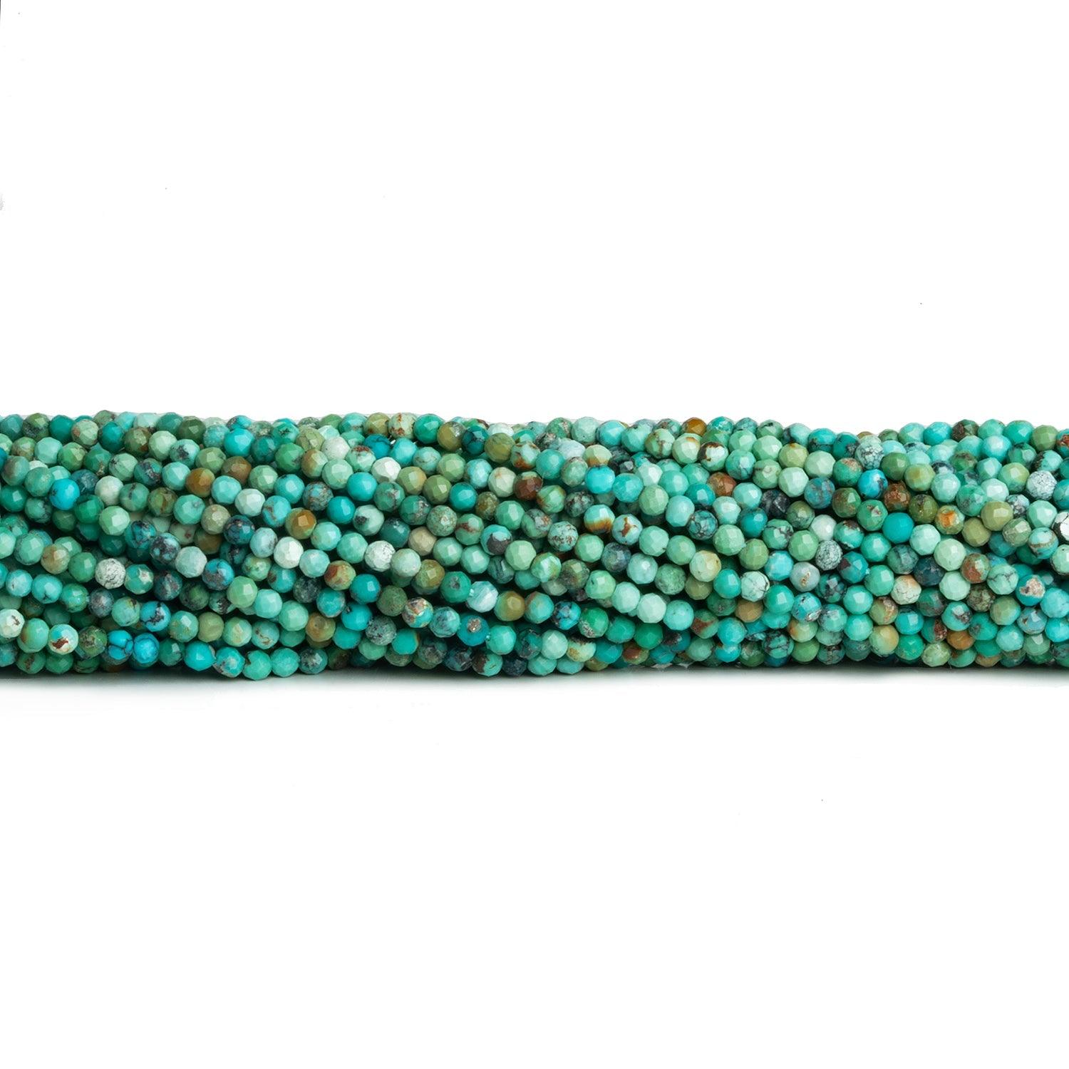 These exquisite 2mm turquoise micro-faceted round beads are a celebration of nature's artistry, showcasing a breathtaking palette of hues. The vibrant turquoise blues are enriched by earthy veins of brown, tan, and subtle green, reminiscent of desert landscapes and mineral-rich terrains.