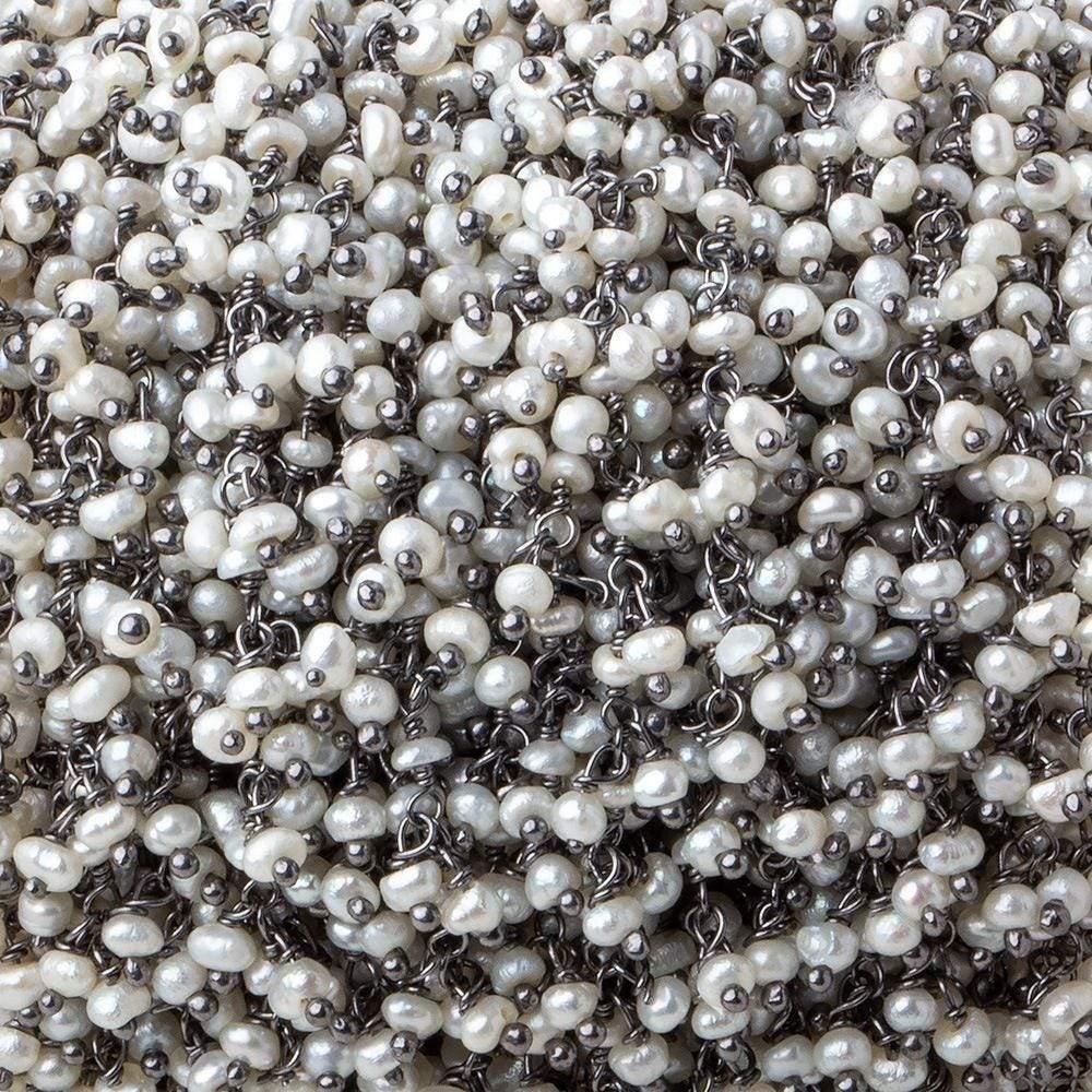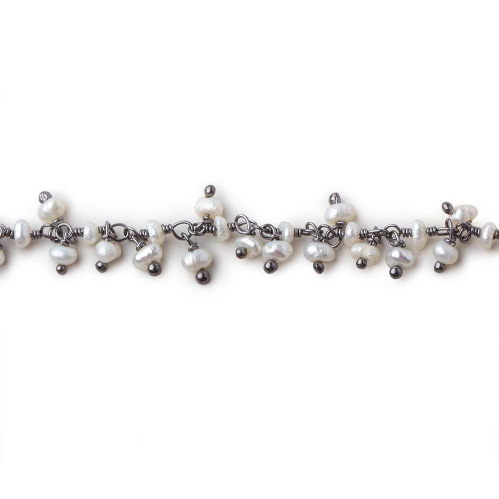 2mm White Baroque Pearl Black Gold Dangling Chain sold by the foot. These White Baroque shaped pearls are fairly symmetrical with consistent quality and color whether buying by the foot or the spool.