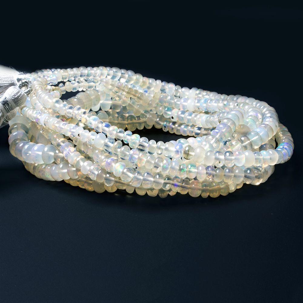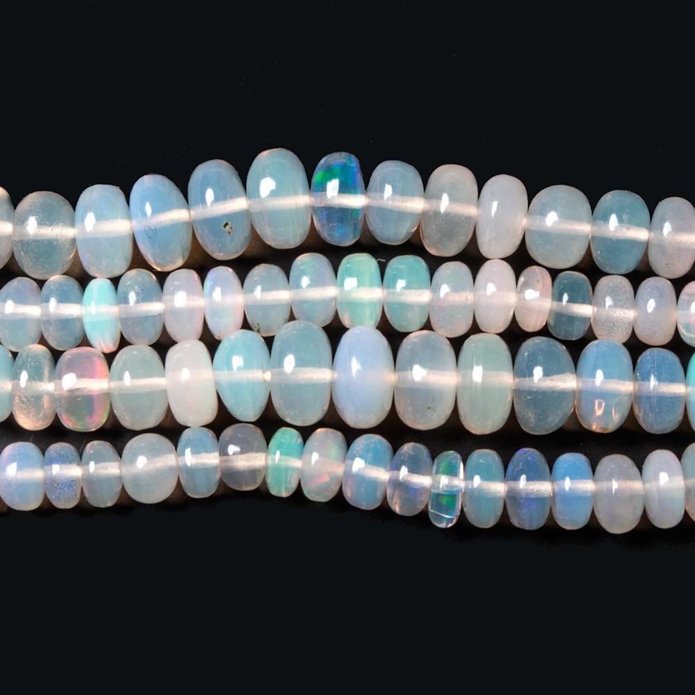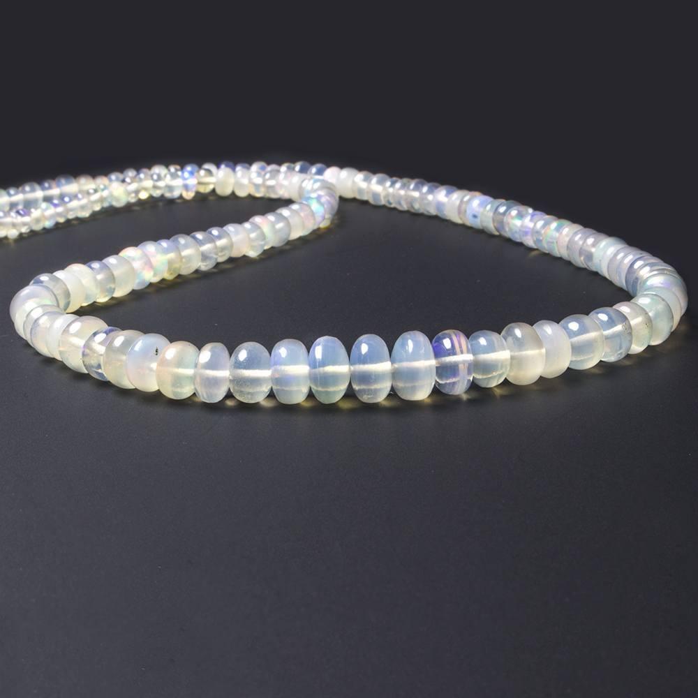 Off White Ethiopian Opal unfaceted Rondelles measure approximately 3mm graduating up to 6mm in diameter size, these gems have a waxy luster with excellent polish, the beads show no visible matrix in these translucent opal bodies. These Ethiopian Opal beads have excellent play of color in red-blue-green-orange-periwinkle hues, their color is an off white hue. These Jelly Opal gemstones are mined in Ethiopia Africa.