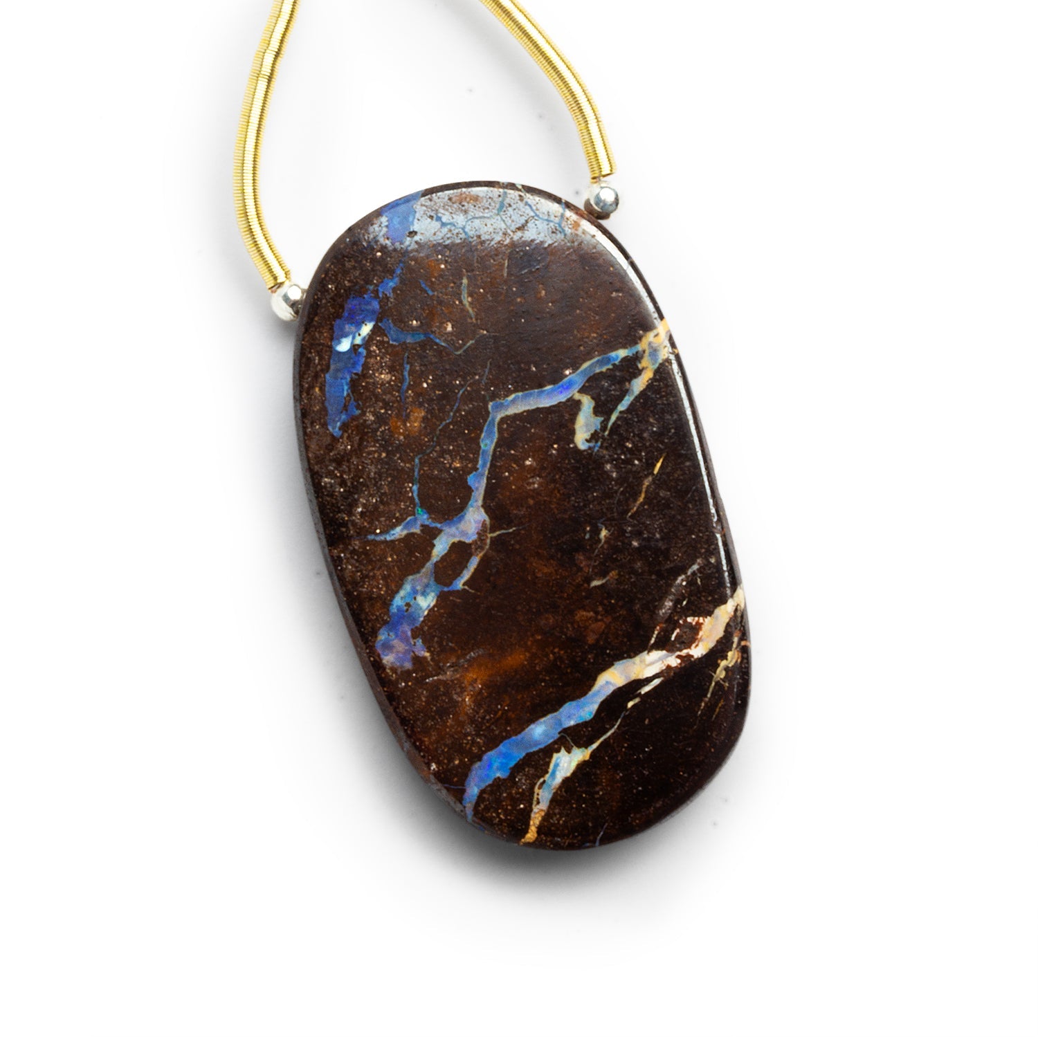 Expertly polished with a softly rounded surface, this generously sized nugget makes a striking centerpiece in any design. The naturally sculpted form and moody color palette give it a raw, elemental elegance, perfect for artisanal statement necklaces or grounding a multi-strand layout. Drilled horizontally at the top and strung with a gold-tone wire for easy integration into your work, this Boulder Opal bead is a treasure for bold, earthy aesthetics and collectors of rare, natural gems.