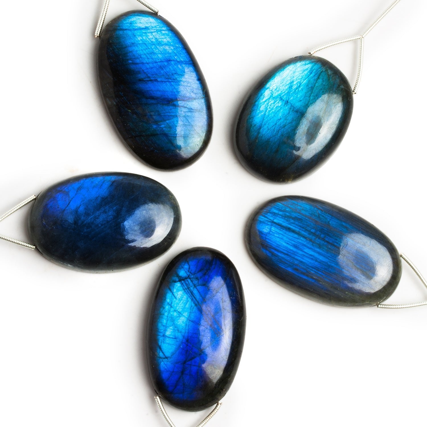 These 38x27mm Neon Blue Labradorite Plain Oval Focal Pendants showcase intense, electric blue flash that sweeps across each surface with striking depth and movement. The saturated labradorescence contrasts beautifully against the darker base, creating a bold, almost glowing effect that shifts with every angle.