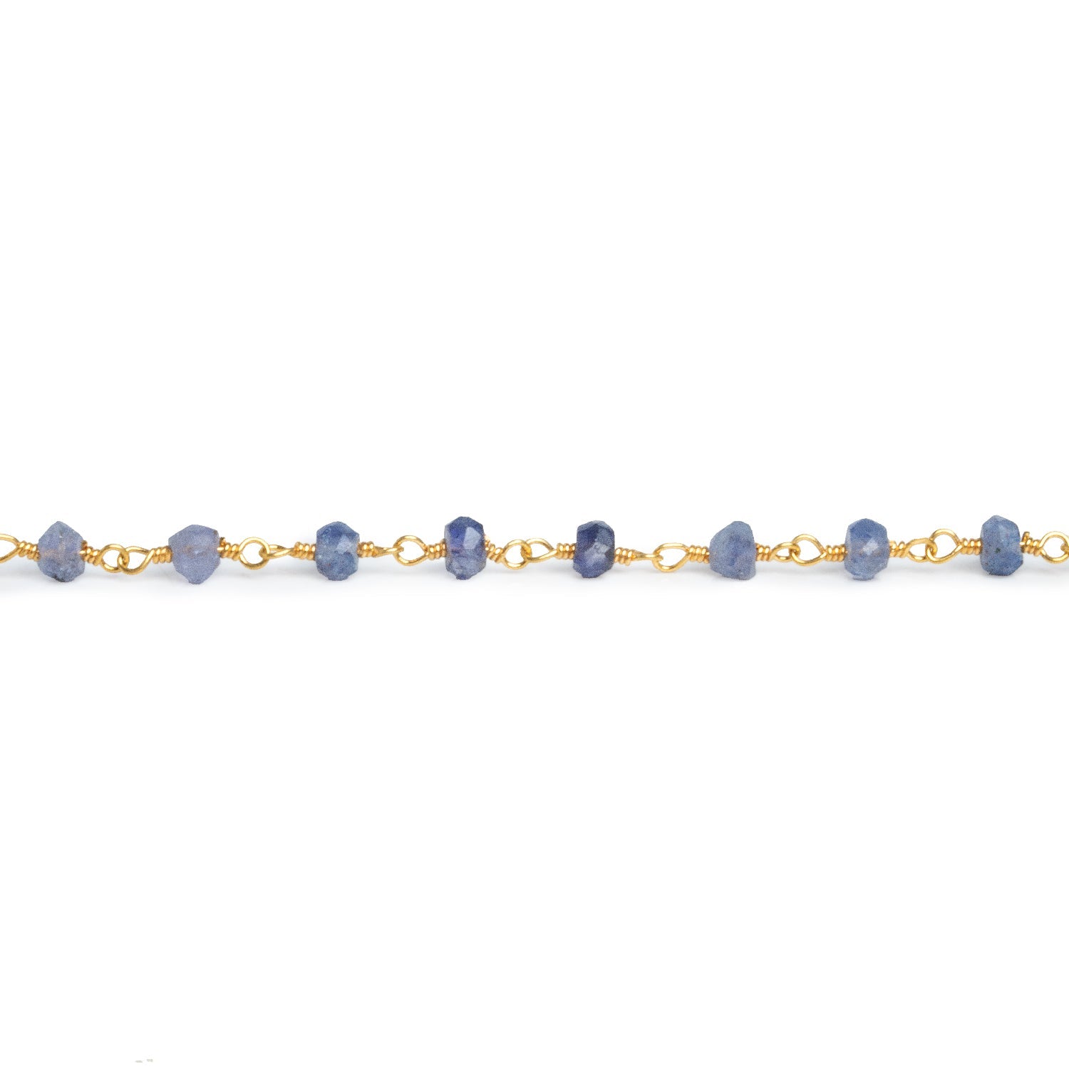 These Iolite Faceted Rondelle Beads are handwrapped with gold-plated copper wire, creating a stunning contrast between the cool, violet-blue hues of the iolite and the warm, lustrous shine of the gold chain. Each bead measures approximately 3mm in diameter, and there are 40 beads per foot, allowing for elegant drape and movement in any design. The faceted rondelle shape enhances the natural brilliance of the iolite, reflecting light with a subtle shimmer, while the gold chain provides a luxurious touch.