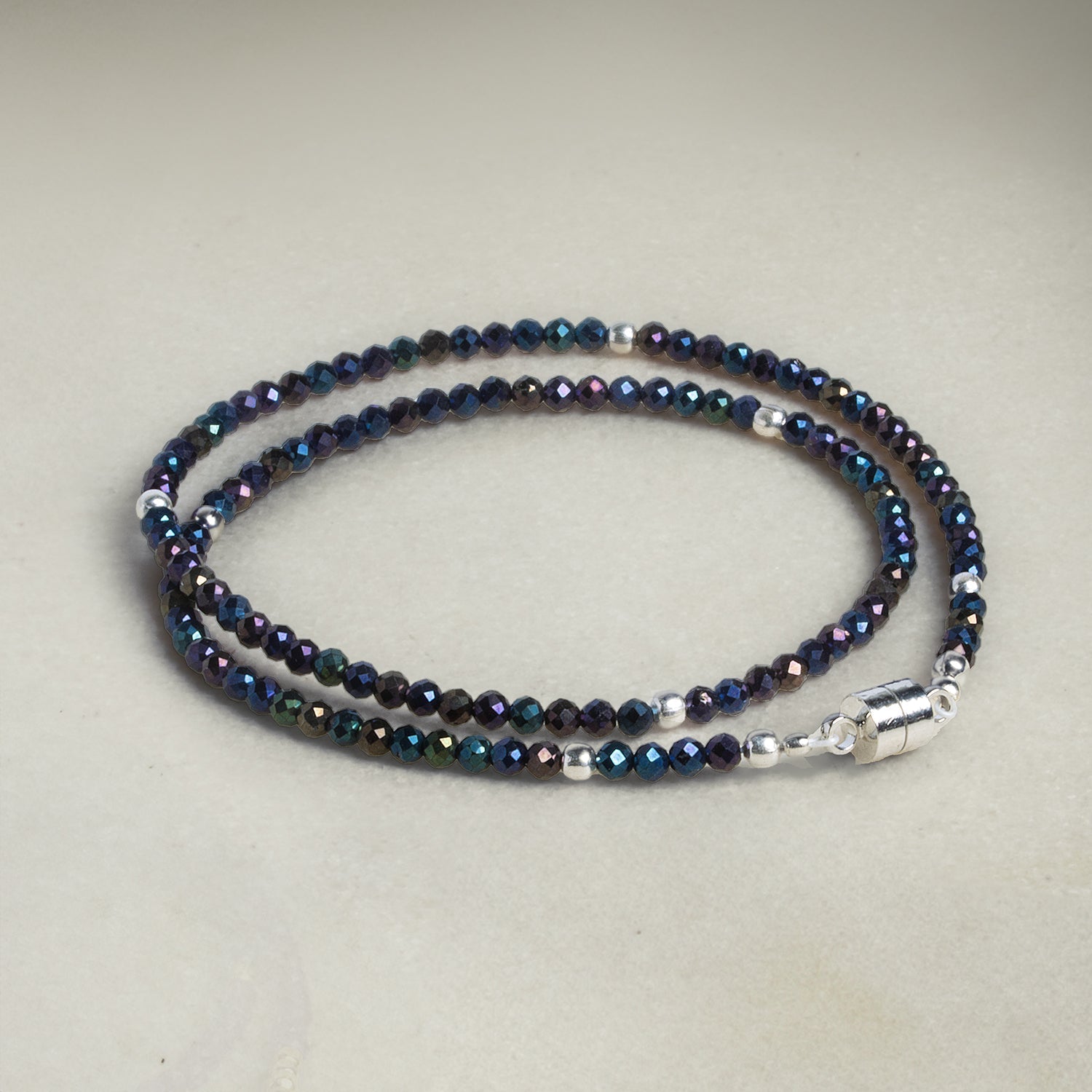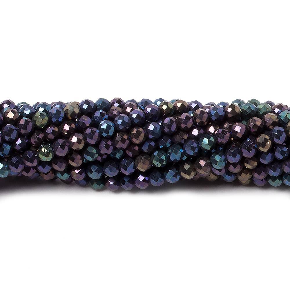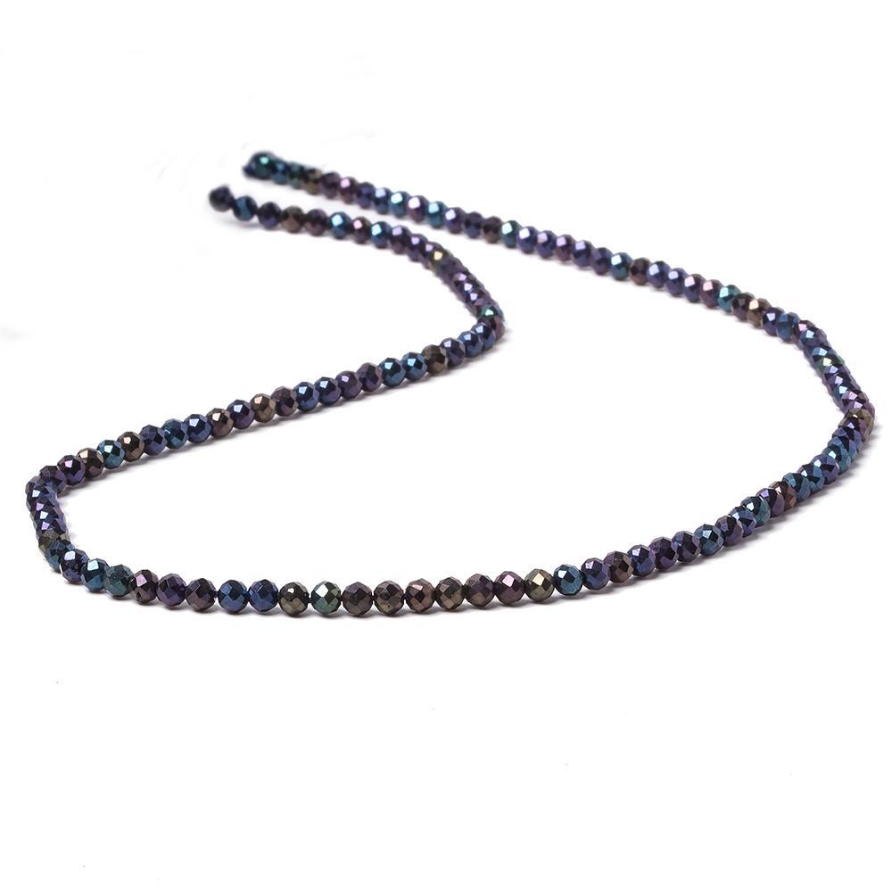 3mm diameter Peacock Metallic Black Spinel Micro faceted round beads on 13 inch length having 128 pieces per strand having a highly metallic luster on these expertly crafted beads showing excellent symmetry and brilliance with a perfect micro fine facet. These sparkling gemstone beads have an electroplated Titanium coating.