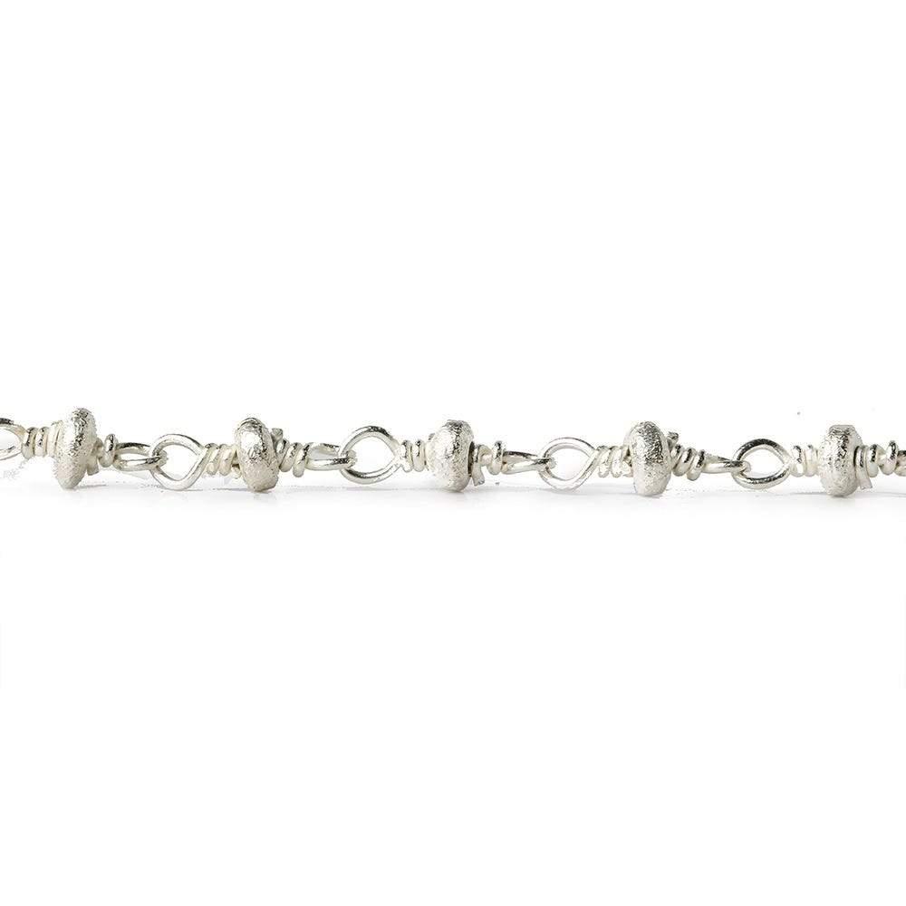 3mm Silver plated Brushed Rondelle Silver plated Chain is a sturdy, hand crafted rosary chain sold by the foot. 3 quantity = 3 continual feet.