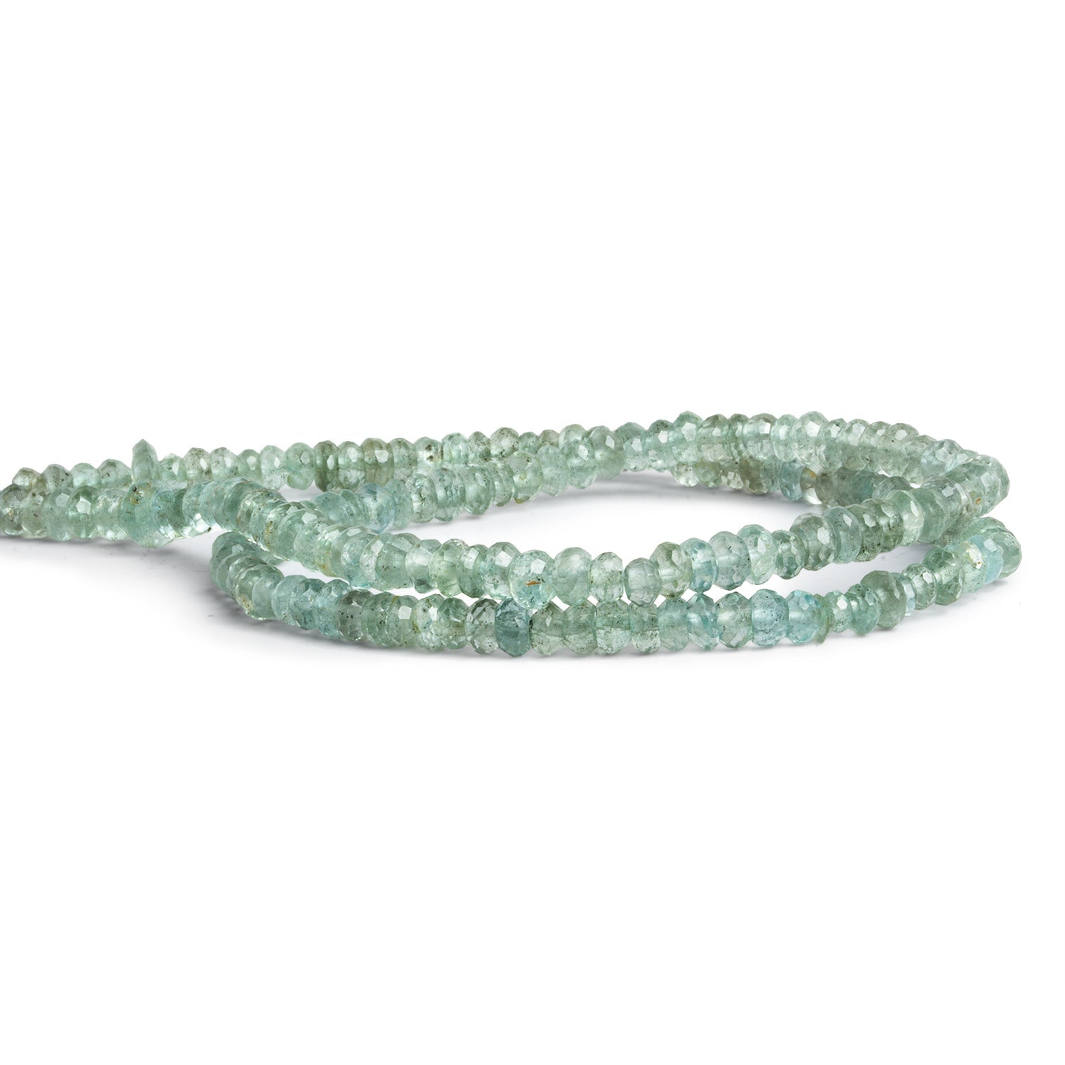 These Moss Aquamarine Faceted Rondelle Beads shimmer with sea-glass tones, blending tranquil blue-greens with delicate mossy inclusions for a truly organic, earthy appeal. Measuring approximately 4mm to 5mm in diameter, each bead is precision-cut to reveal a subtle brilliance that enhances the stone's naturally varied coloration.