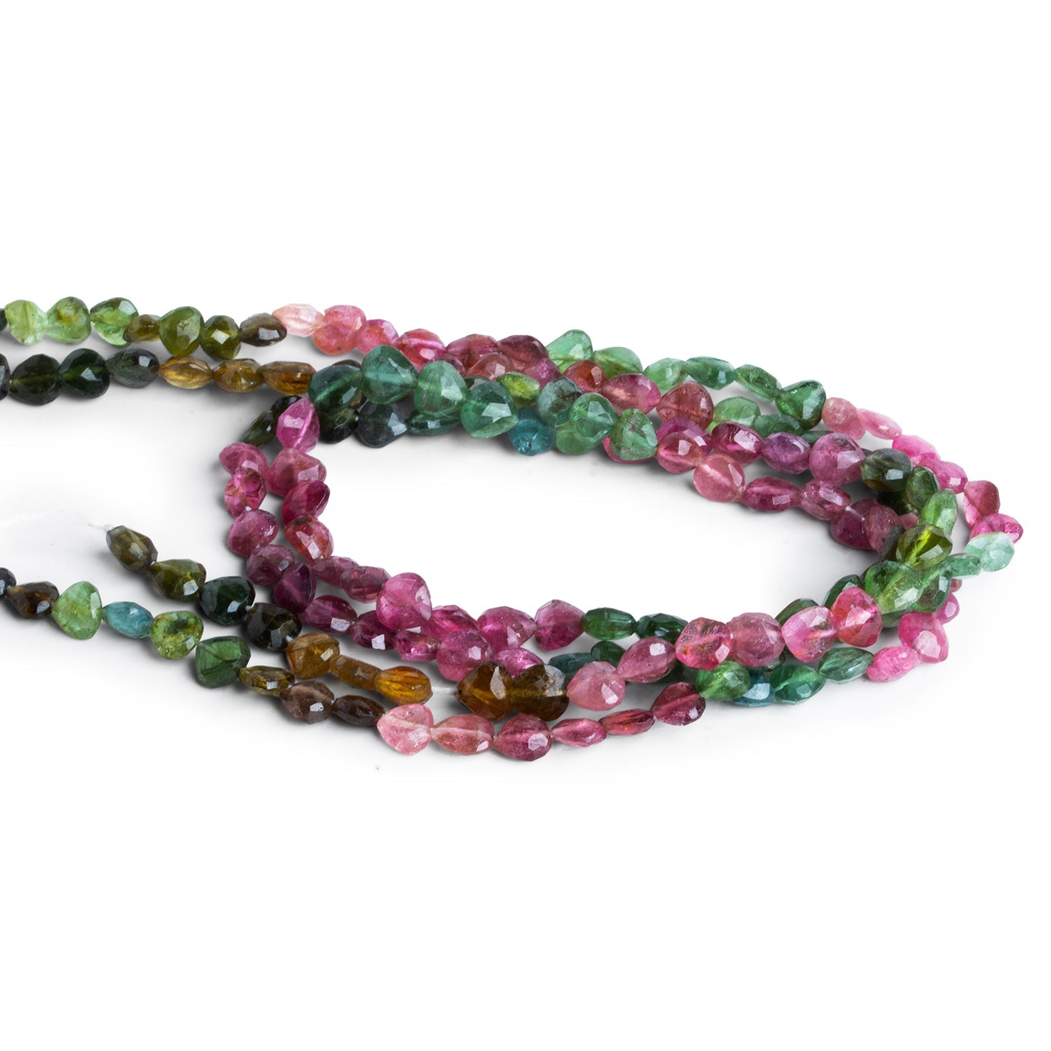 This vibrant strand showcases the remarkable color diversity that makes tourmaline so beloved among gemstone collectors and designers. Each small heart-shaped bead reveals a rich spectrum of natural hues, including shades of rose pink, raspberry, emerald green, forest green, golden olive, and occasional hints of teal. The lively mix of colors creates a beautifully balanced strand full of energy and character.