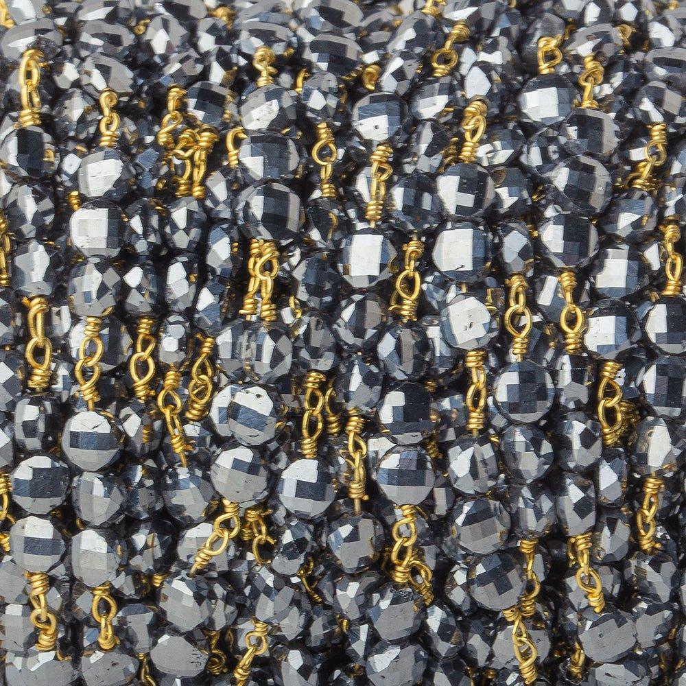 Silver Metallic Crystal faceted coin Trio Gold plated Chain sold by the foot having 48 beads per length and bead diameter measures approximately 4.5mm.