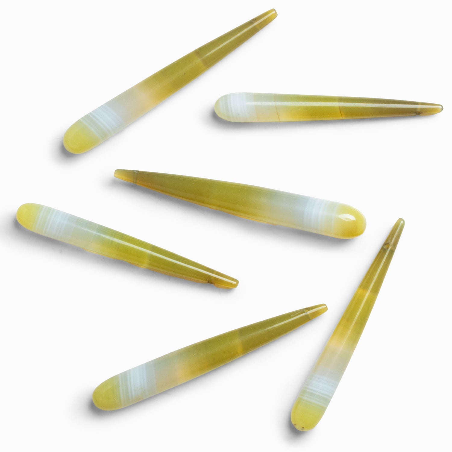 Beads range from about 36x7mm to 55x7mm. These sleek teardrops feature smooth polished bodies with a spectacular display of banding mingling rich yellows with subtle greys and off-whites. Our curated, color-enhanced Chalcedony Teardrops are perfect for use as the focal point of eye-catching earrings, necklaces and more!