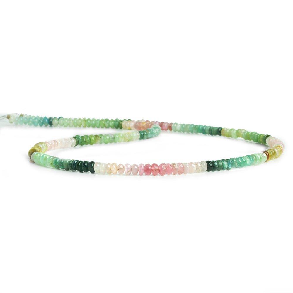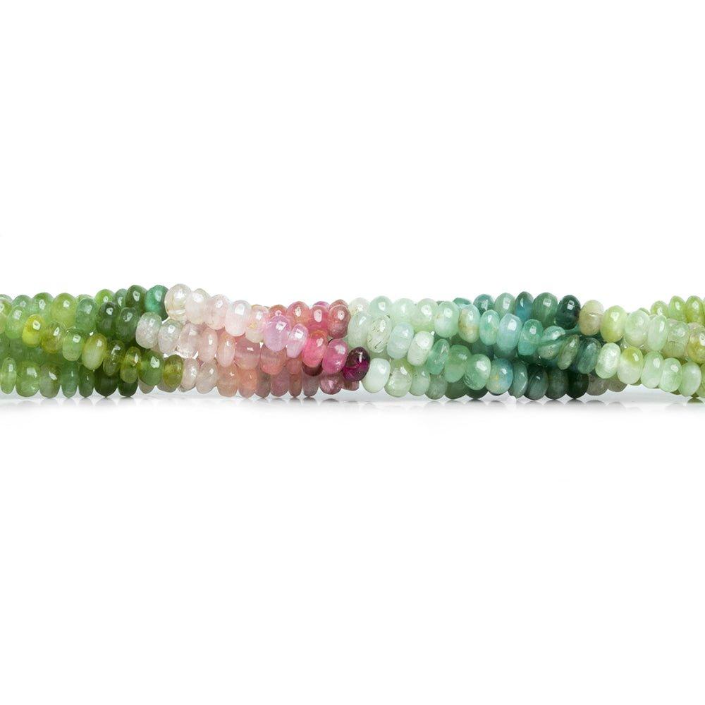 Beads average about 4mm in diameter. These Multi Color Rondelles have a vitreous luster with a transparent to milky body exhibiting a lovely multi-tonal patterning. Springy greenish blues mingle prominently with pinks and yellows in these curated strands of deeply saturated, high-grade Tourmaline. Bead size, shape & patterning are highly consistent across and between strands.