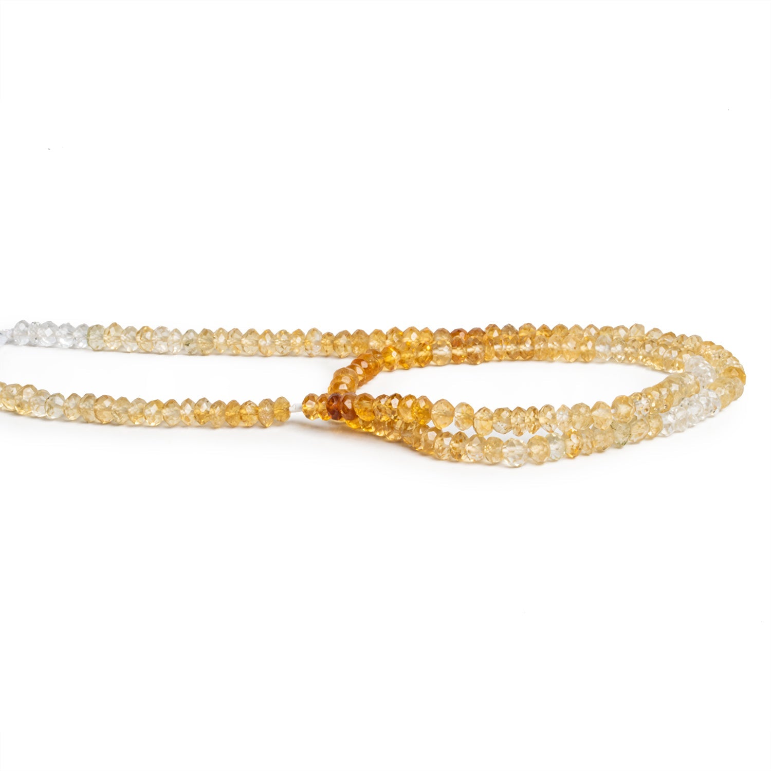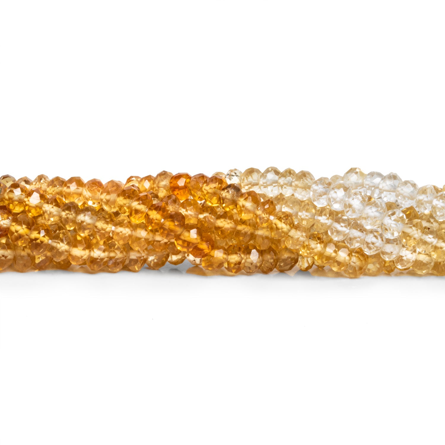 These Shaded Citrine Faceted Rondelles measure approximately 4mm in diameter. The strand showcases a beautiful gradient of citrine hues, ranging from pale yellow to a deeper amber tone. The beads are faceted, allowing them to catch the light with a subtle sparkle that enhances the rich, warm tones of the citrine. This striking color variation adds depth and dimension to designs, making these rondelles perfect for a variety of jewelry projects where a touch of sunshine and sophistication is desired. Sold in strands, these versatile beads are ideal for creating elegant necklaces, bracelets, or earrings.