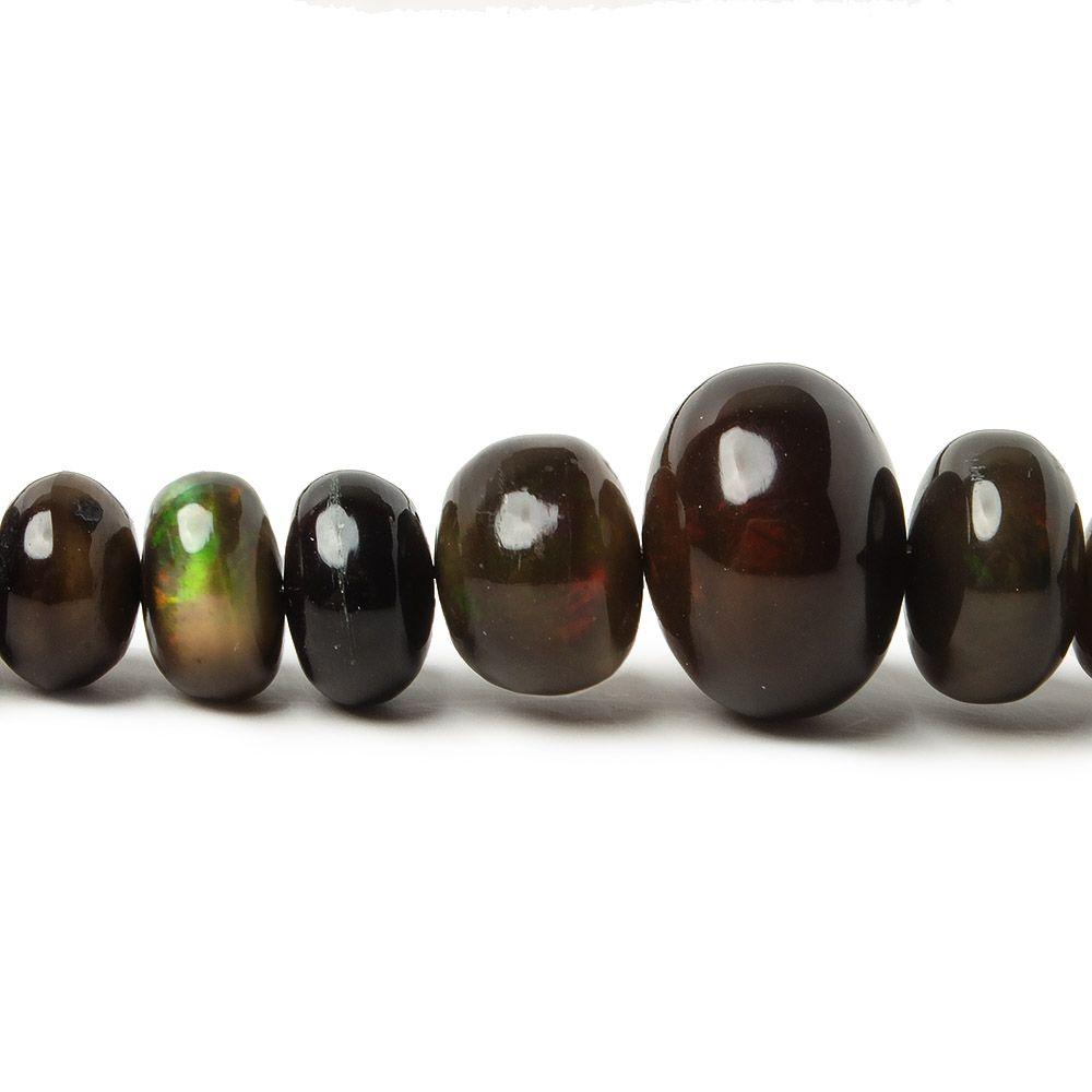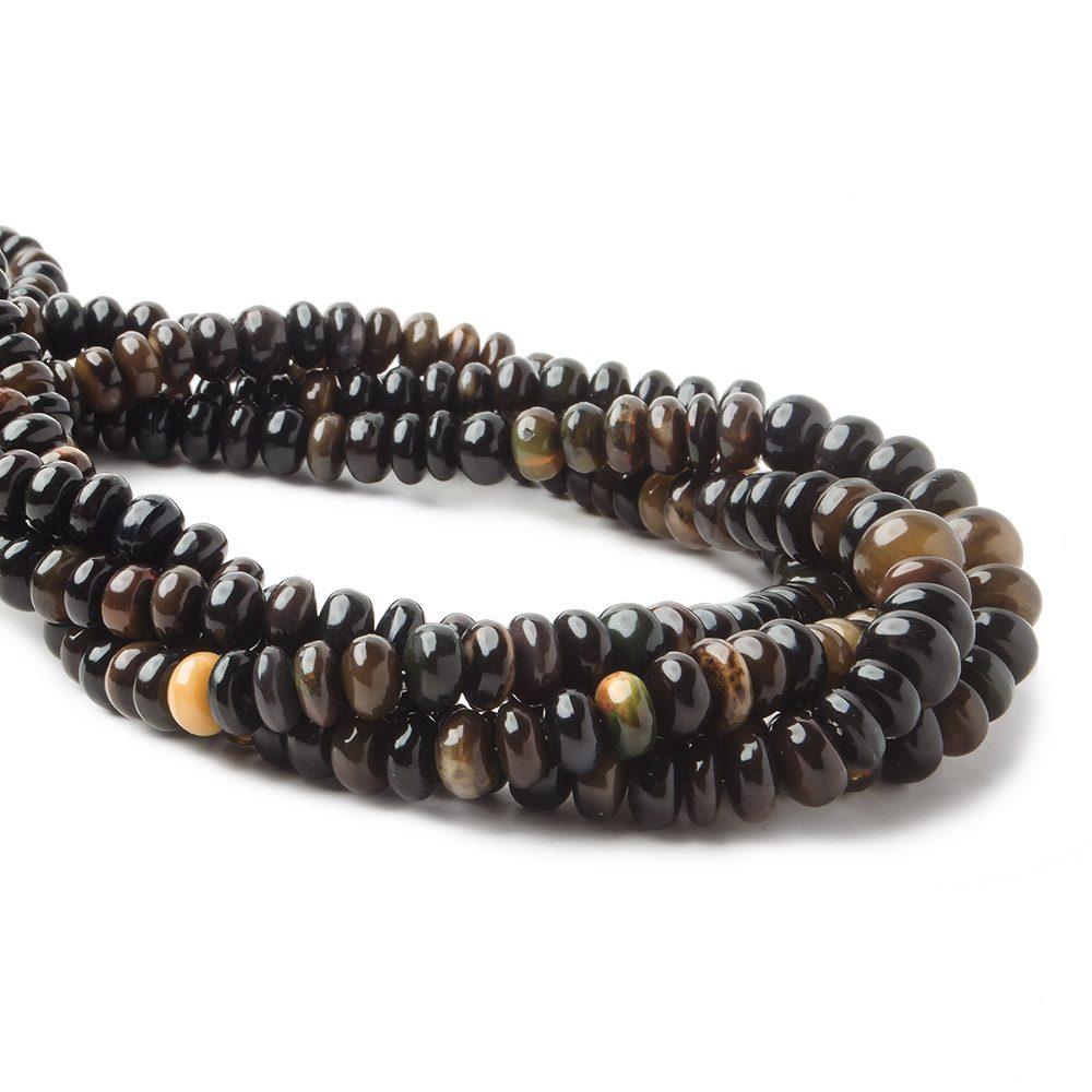 5mm to 8mm Black Ethiopian Opal plain rondelle beads on the 16 inch strand of approximately 115 pieces.