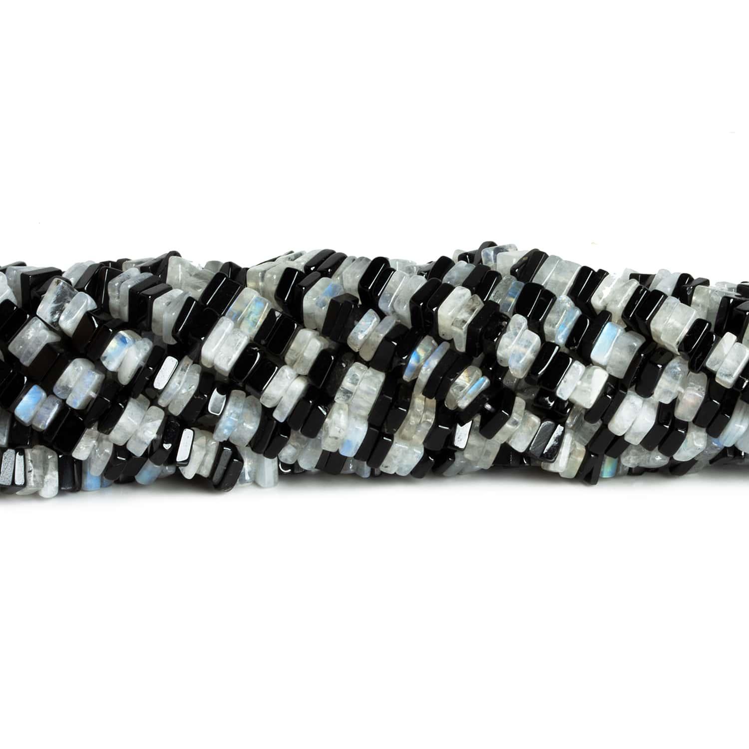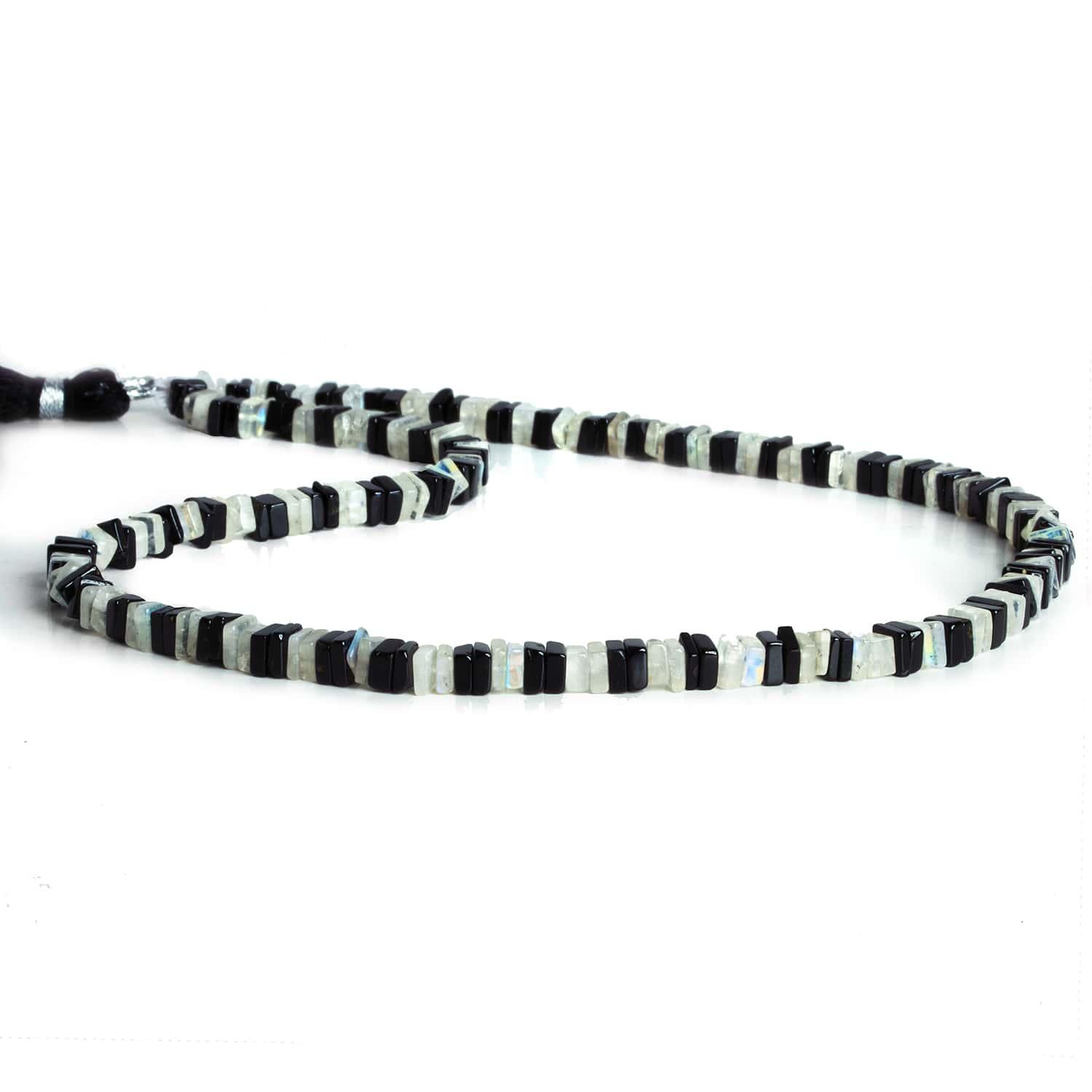 Beads average 5mm in diameter. These smooth polished, plain square heishi shapes show off sleek bodies that fit together wonderfully. These curated strands combines alternating pairs of Rainbow Moonstone and Black Spinel heishis. Expect beautiful blue flash to be prominent in the Rainbow Moonstone portions!