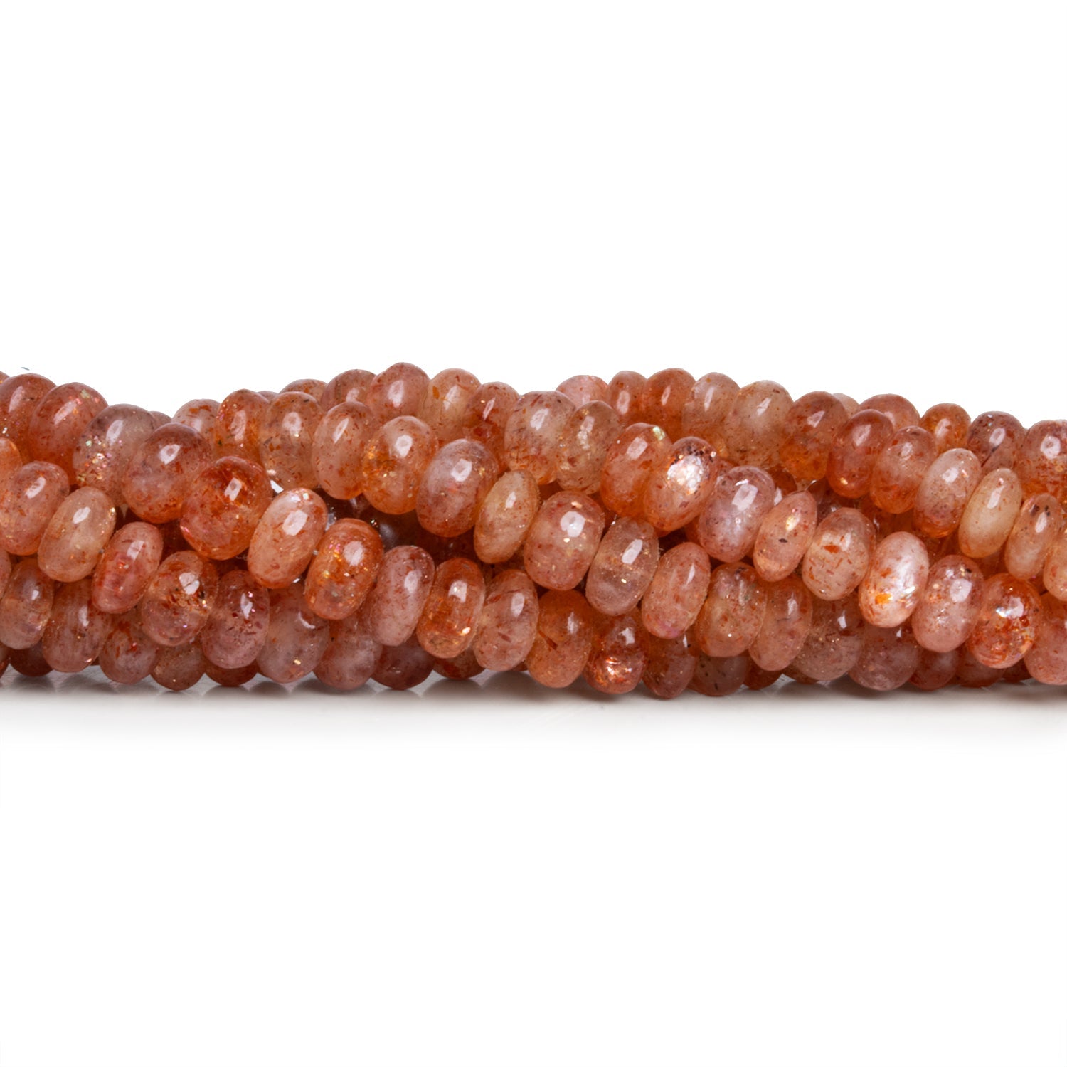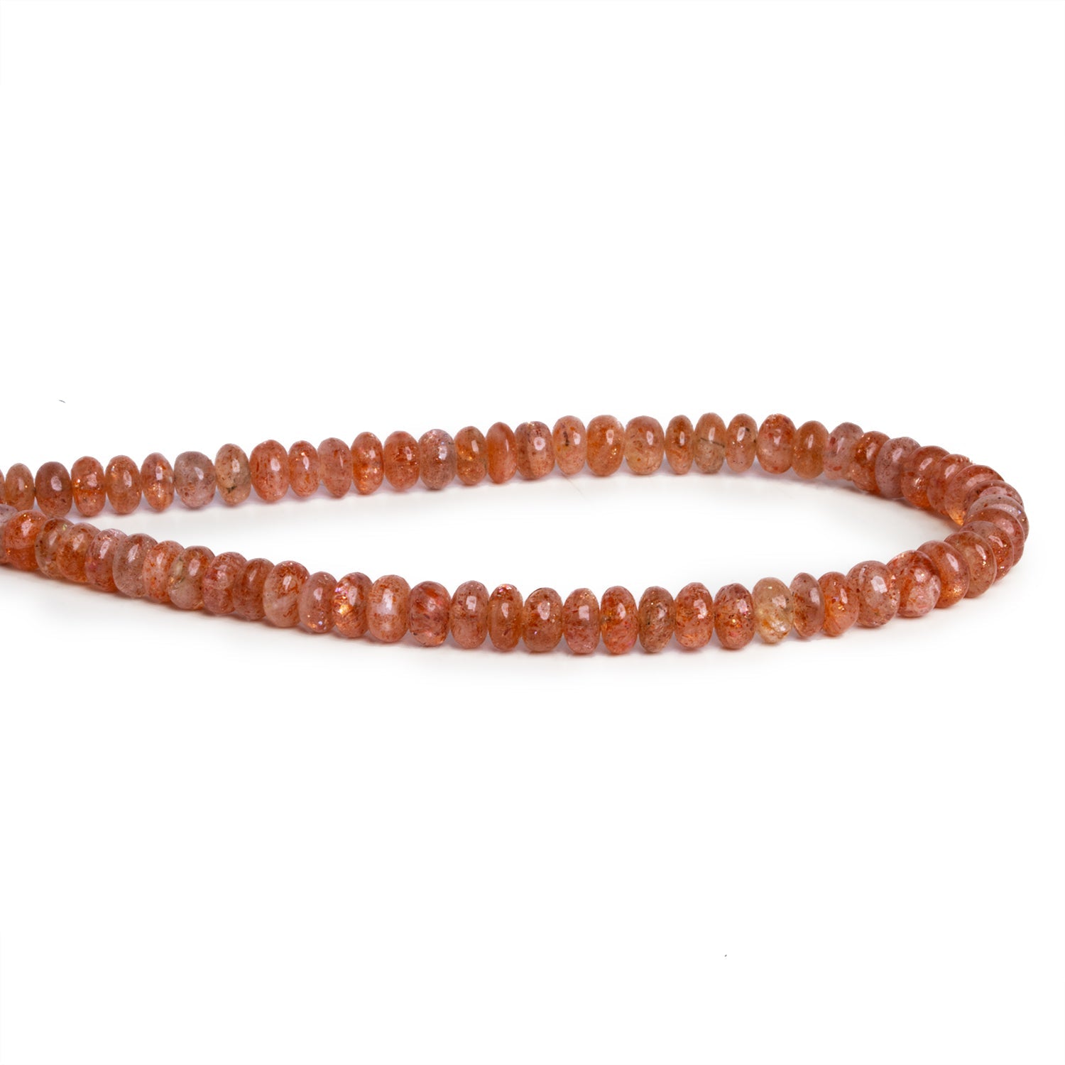 These Sunstone Plain Rondelles, averaging 5mm in diameter, embody a radiant natural beauty with their warm, golden-orange hues. Known for their glittering, reflective inclusions, these beads capture the light in the most captivating way, emitting a soft shimmer that is characteristic of sunstone. Each rondelle is polished to perfection, highlighting the stone's inherent shine and smooth texture. The striking tones of sunstone—blending golden oranges, reds, and copper hues—give these beads an elegant, lively energy that evokes warmth and vitality.