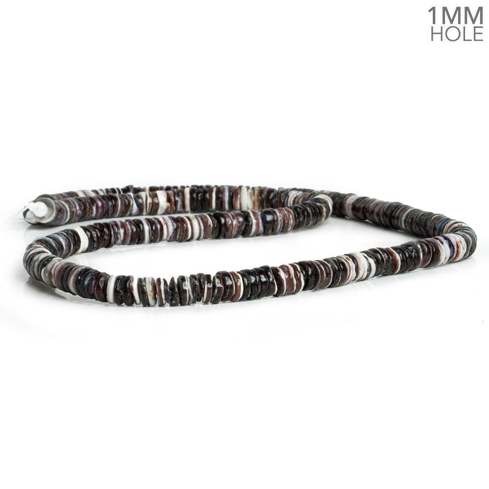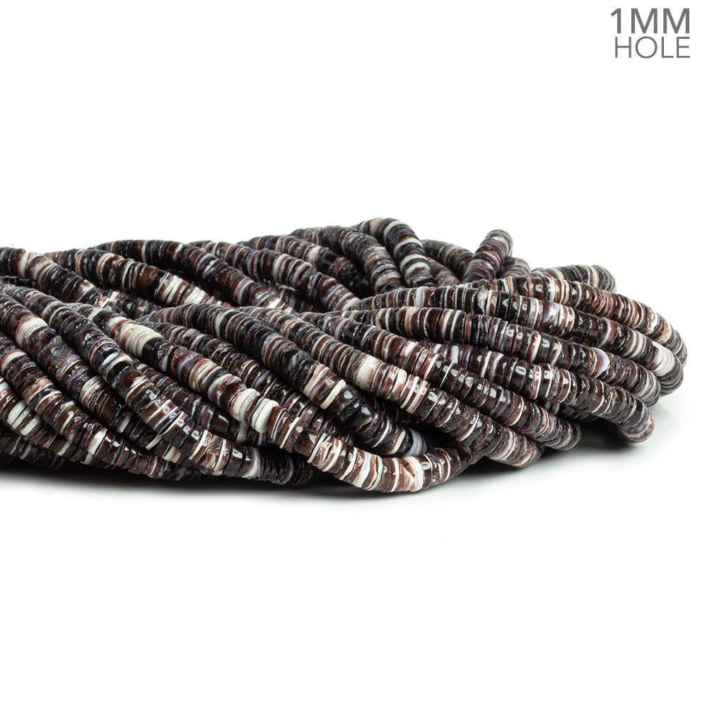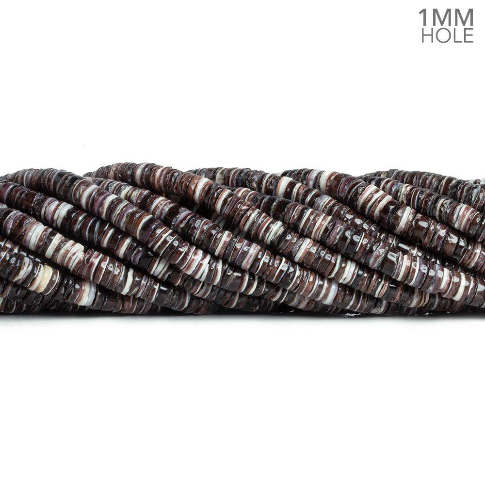 Beads average 5mm to 5.5mm in diameter with some minor variation. These exceptionally thin natural shell Heishi beads combine dark purplish tones with white in a brilliant tableau. These beads are crafted to match for size and color palette on the strand.