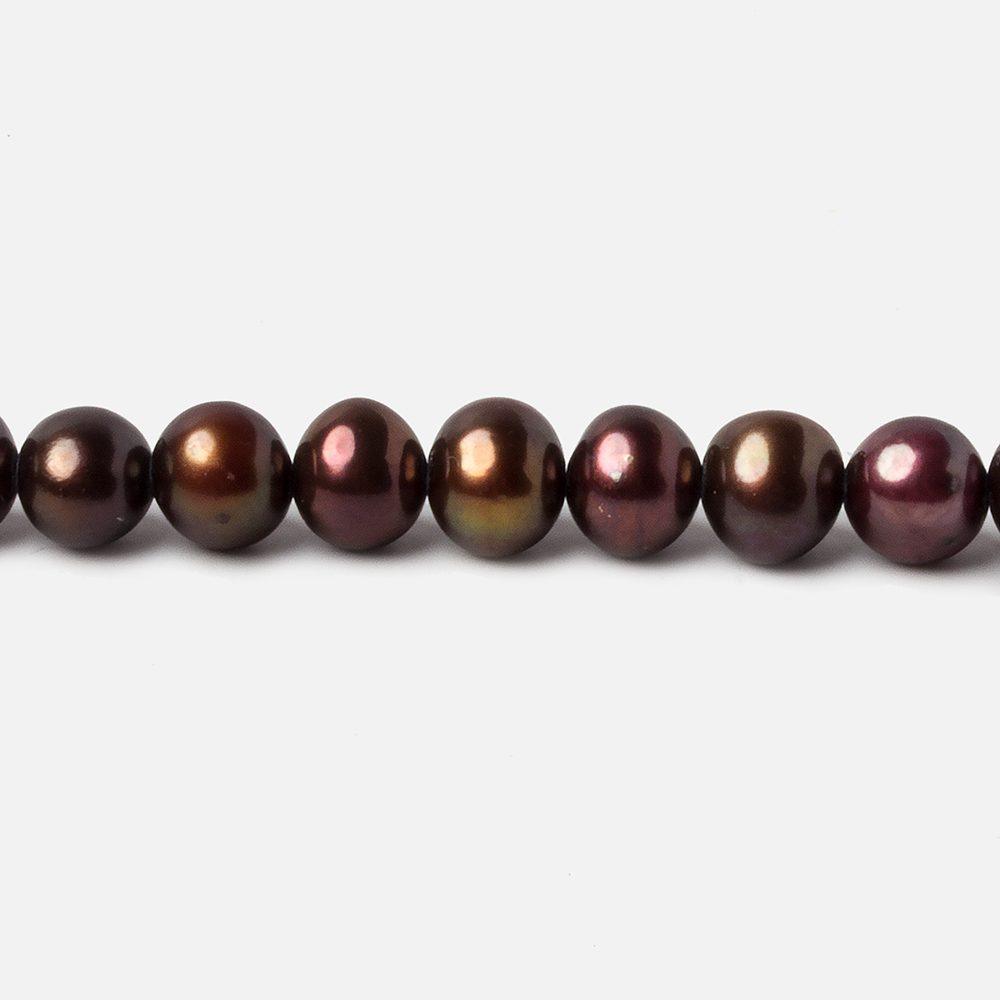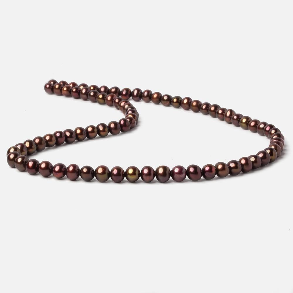 These purplish chocolate freshwater pearls, side drilled and off-round in shape, exhibit outstanding luster and high-quality nacre. The pearls are carefully matched on the strand, maintaining consistent size and balanced symmetry. This strand contains 76 color-enhanced freshwater pearls, sized between 5x4mm and 6x5mm.