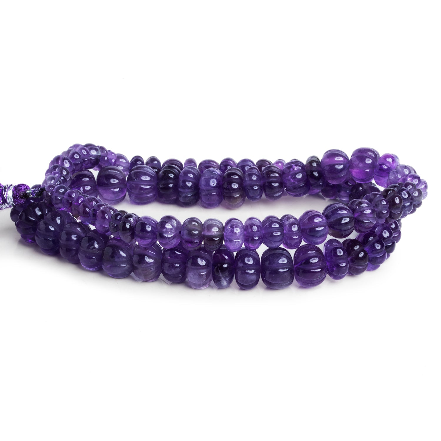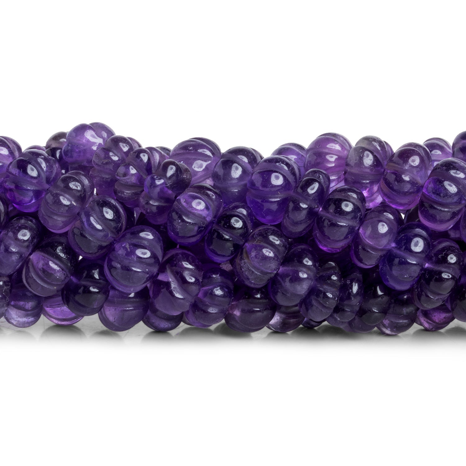 Beads measure about 6mm to 11mm in diameter. Explore the stunning hand carved finish of these richly colored and sizable Amethyst offerings. A strong and consistent purple hue stars in these ribbed melons whose shape is sure to impress with its craftsmanship. Our specially curated Caved Melon offerings are perfect for a wide range of Jewelry Designs from necklaces to bracelets and earrings. Sit down to your next slate of creative projects with a strand(or ten) of our signature Melons and see where your inspiration takes you!