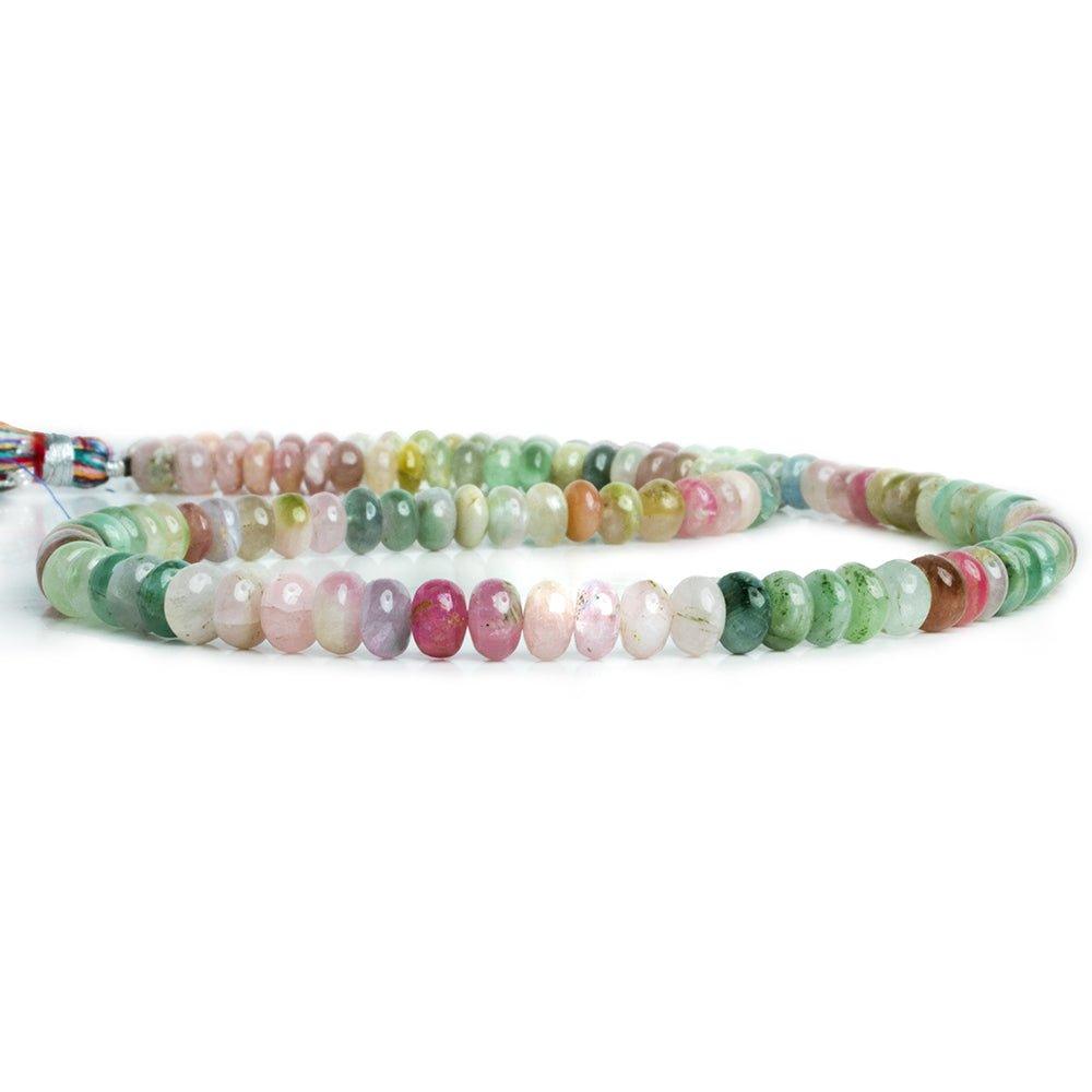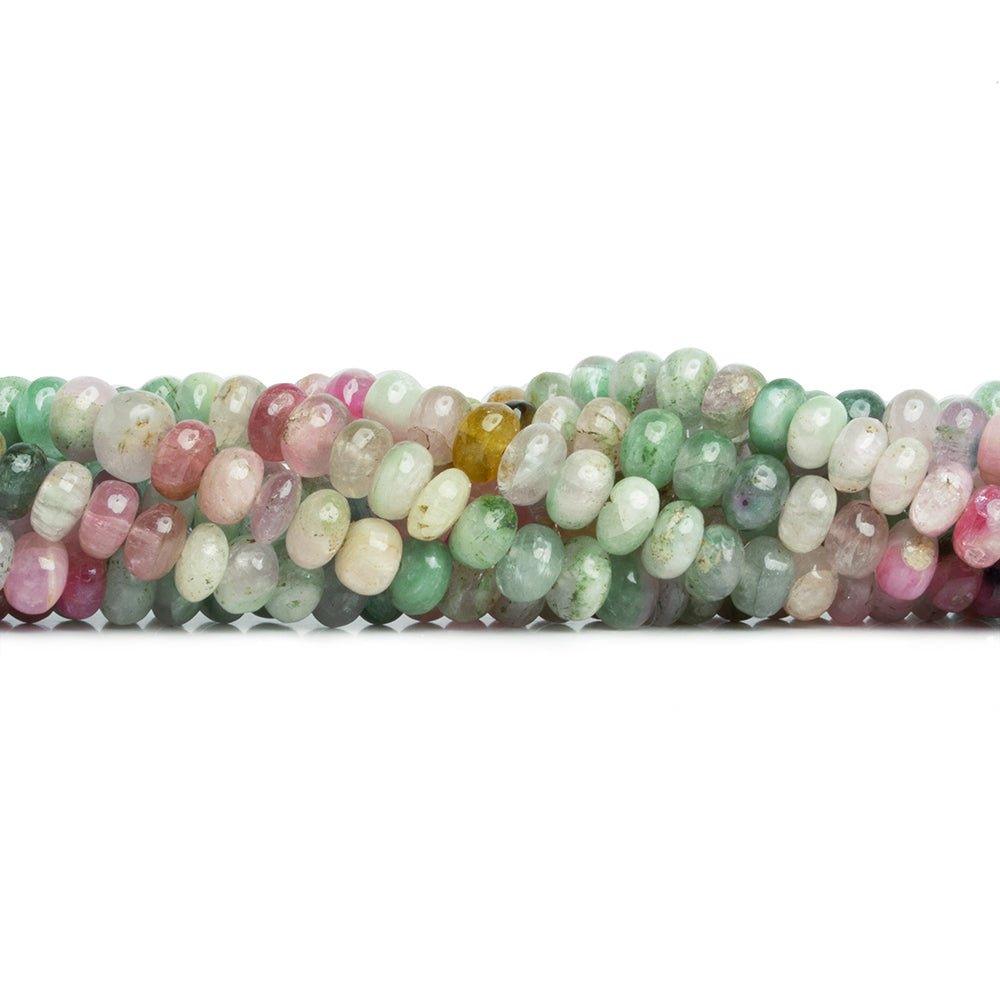Beads average about 6.5mm in diameter. These Multi Color Rondelles have a vitreous luster with a transparent to milky body exhibiting a lovely multi-tonal patterning. Springy greenish blues mingle prominently with pinkish purples and deep yellow in these curated strands of high-grade Tourmaline. Bead size is slightly graduated across the strand, so expect some variation in diameter of about 0.5mm.