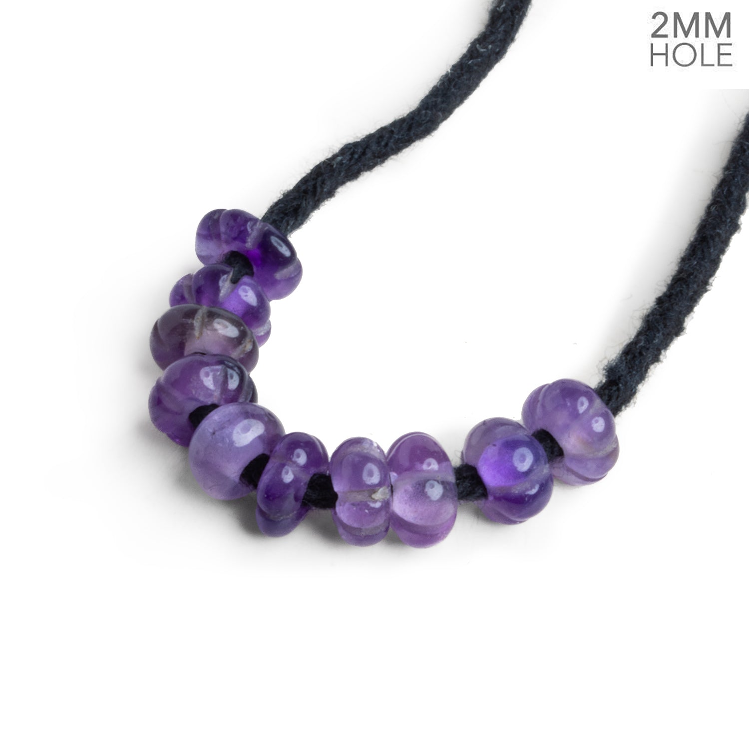 Beads measure about 6mm to 7mm with a 2mm large drill hole. These beautiful offerings show off hand carved craftsmanship on richly colored Amethyst designed to fit with the widest array of cording medium possible. Our versatile Melons are destined to dazzle in jewelry designs from necklaces to earrings and bracelets. Consider these unique pieces when sitting down to your next slate of creations, perfect for stringing on thick leather, showing off a handmade aesthetic and much more.