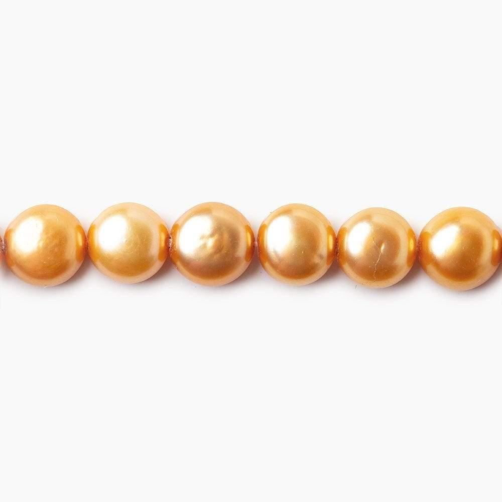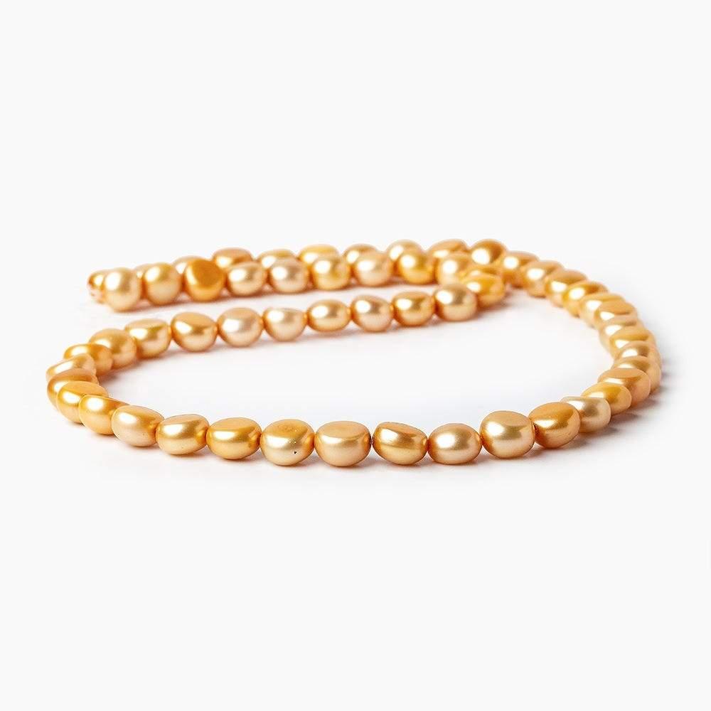 Golden Freshwater Pearl Side Drilled Buttons measure approximately 6-7mm in diameter, have an excellent high luster, excellent nacre quality, well matched on strand, have a symmetrical button shape with uniform size, and the color is a golden buttery hue with a slight brownish tone.