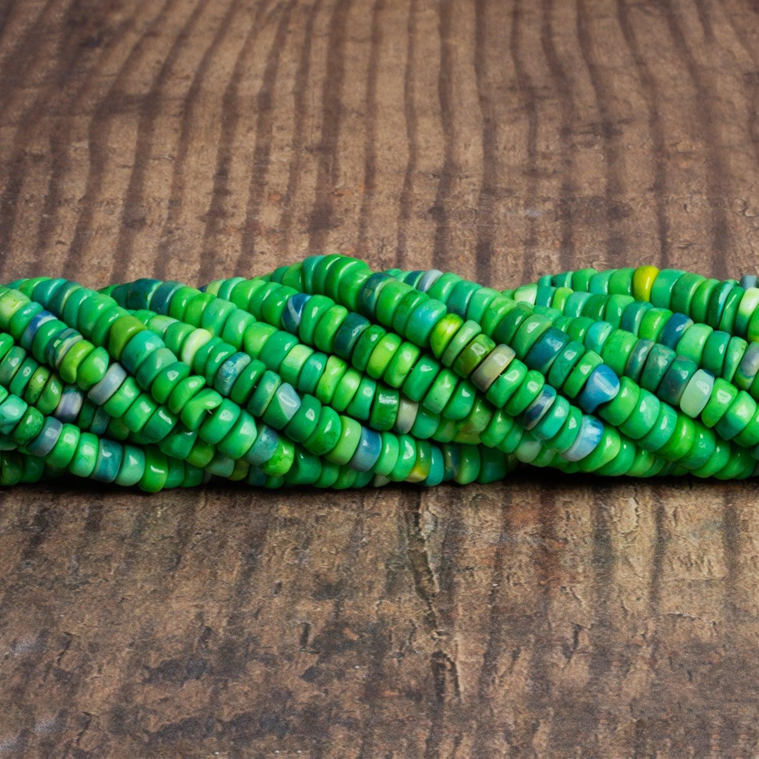 Beads measure about 6mm to 8mm in diameter with a 0.5mm drill hole. These opals show off an eye-catching color palette composed of greens and teal blues. Expect some eye-catching patterns & textures on these unique, curated strands.