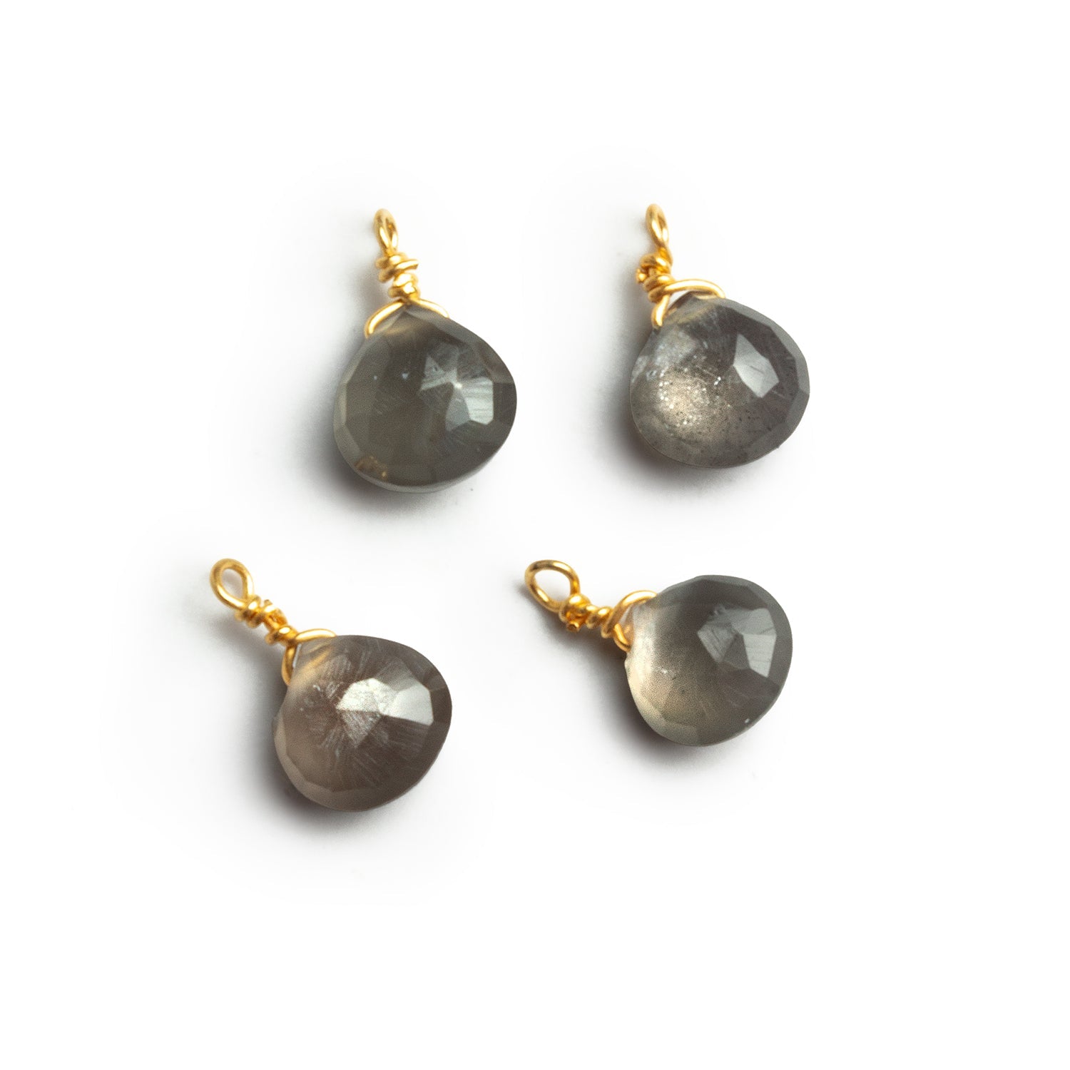 Each 6mm heart is finely faceted to enhance its natural sheen and is hand wire-wrapped in a gold-finish wire for a warm, refined contrast. Offered as a matched set of four, these pendants are ideal for earrings or cohesive jewelry designs. Their moody, luminous character makes them especially appealing for understated, modern, or celestial-inspired pieces.