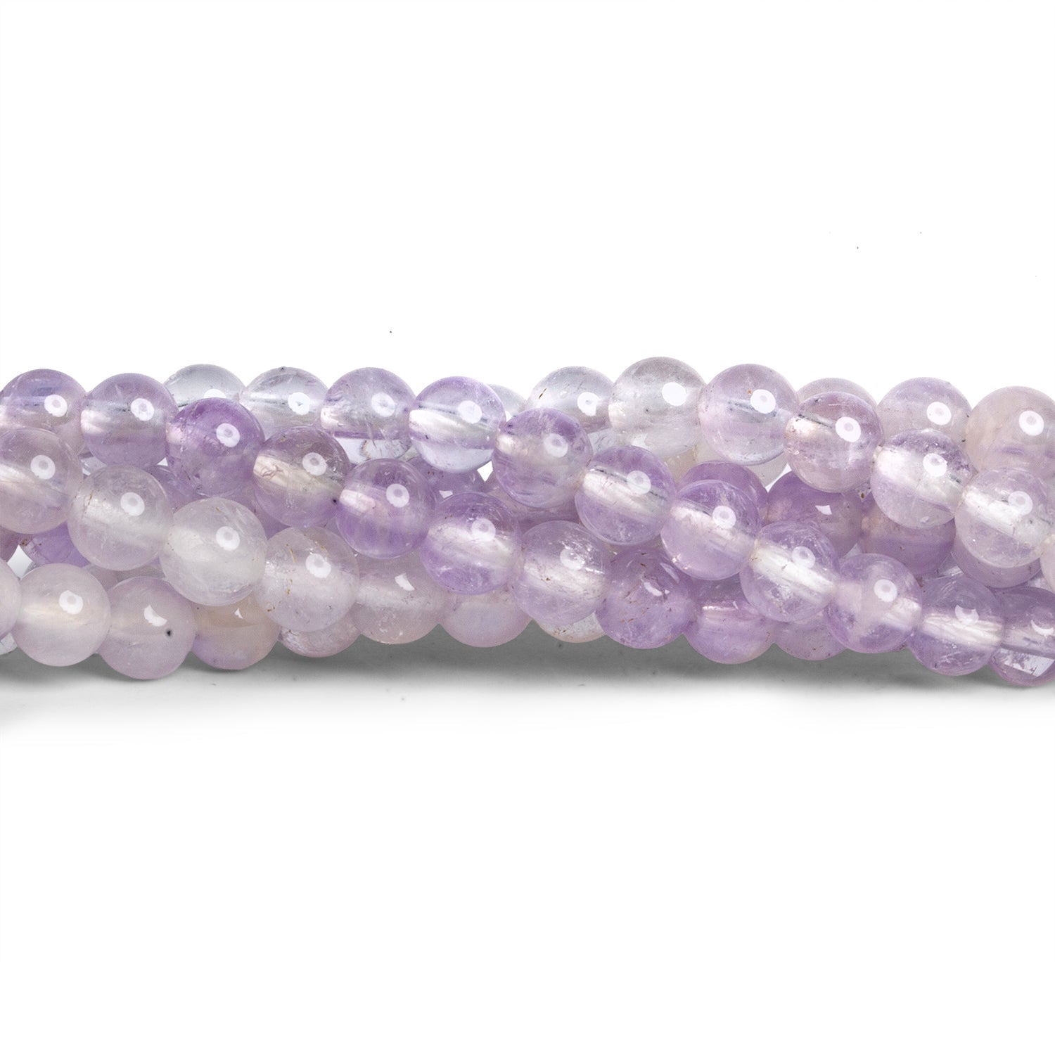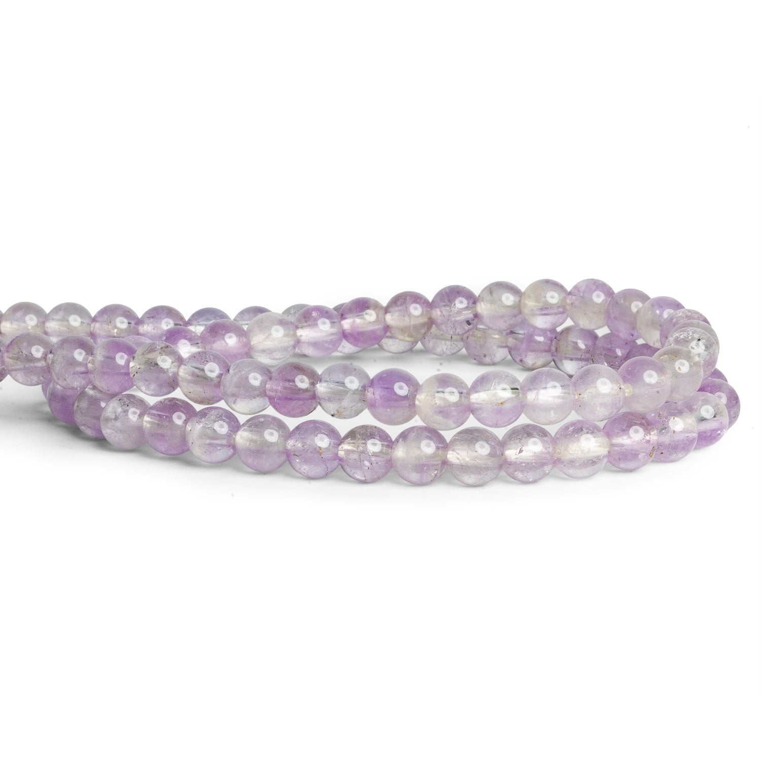 These Light Amethyst Plain Round Beads feature a soft, luminous lilac hue with subtle transparency, allowing their natural internal textures and delicate variations in tone to shine through. Measuring an average of 6mm in diameter, each bead is smoothly polished to a high gloss, enhancing the stone’s gentle play of light. The overall palette ranges from pale, almost translucent lavender to richer, cloud-like swirls of purple, creating a harmonious and soothing visual effect. Their uniform round shape and silky luster make them a versatile choice for designs that emphasize elegance and understated color. Perfect for bracelets, necklaces, or earrings, these Light Amethyst beads carry a refined yet organic charm that blends beautifully with silver, gold, or natural cord. Whether used as the focal element in a minimalist piece or strung with complementary gemstones for added depth, they bring a serene and timeless quality to any jewelry design.