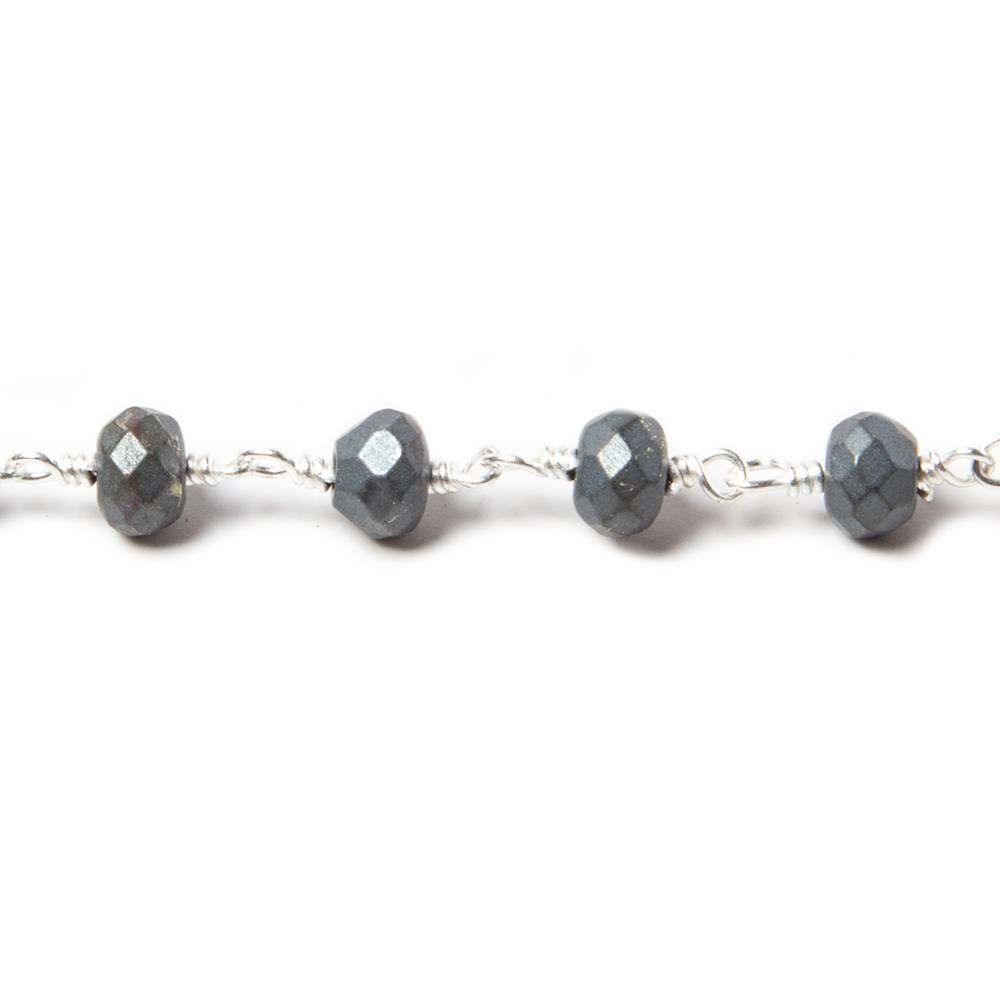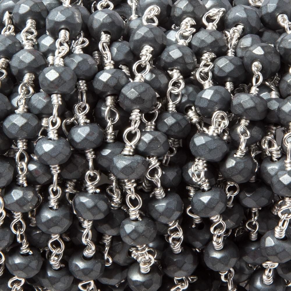 6mm Matte Hematite faceted rondelle Silver plated Chain sold by the foot with approximately 28 pieces on our custom made and hand wrapped Rosary chain.