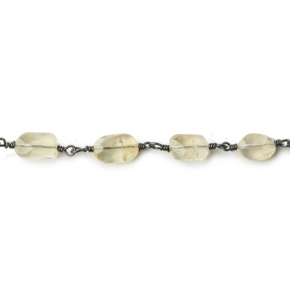 This Black Gold Chain by the foot features 6x4-9x6mm faceted oval Citrine stones that have been expertly hand cut and wrapped for a distinctive and natural look. The unique qualities of light-colored Citrine make for an elegant and one-of-a-kind piece.