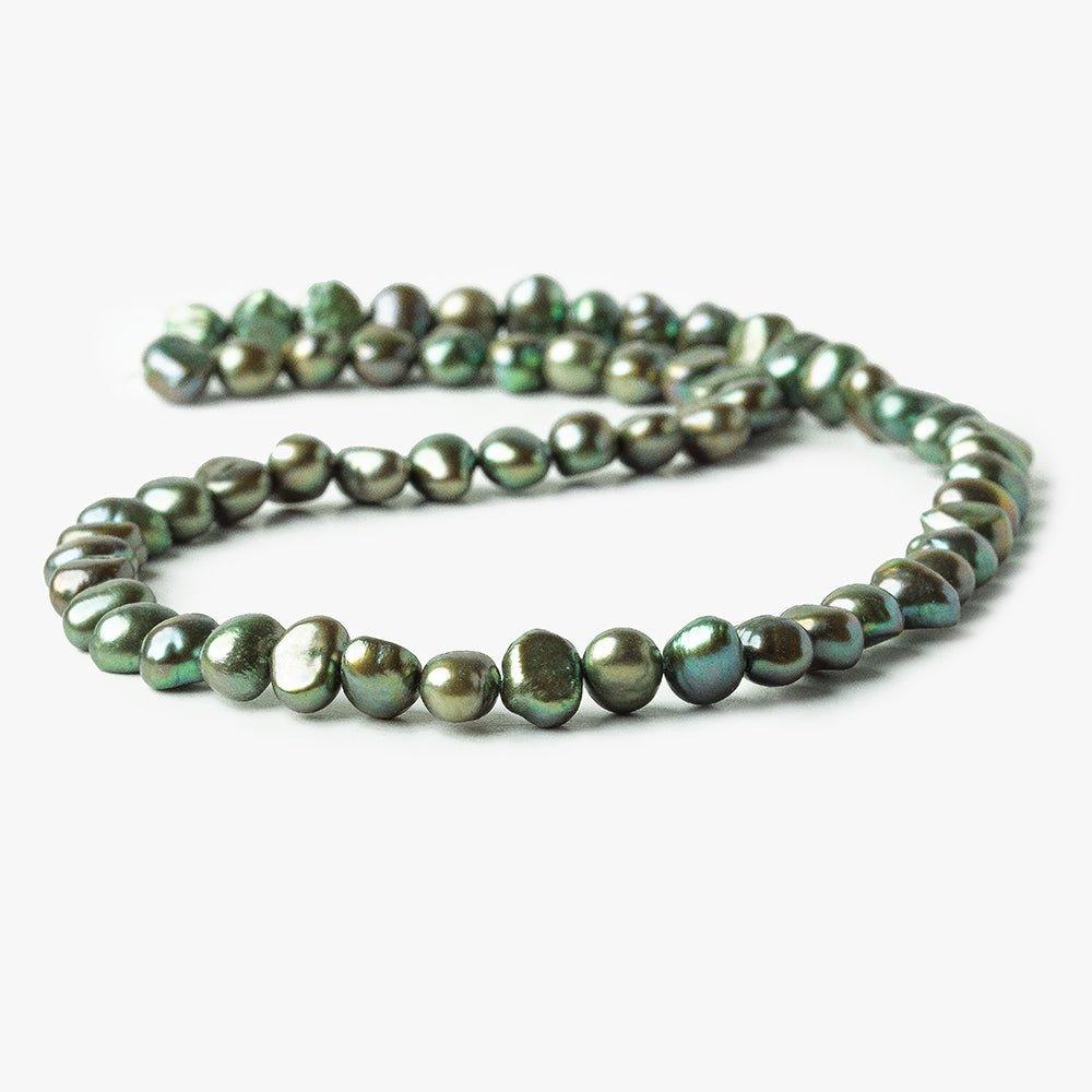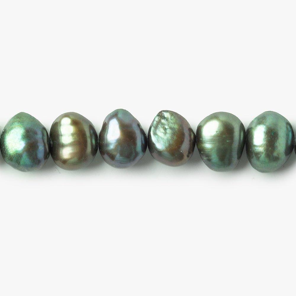 6x5mm-7x6mm approximate measure for these Peacock Green Baroque Side Drilled Freshwater Pearls 16 inch strand of approximately 63 pieces.