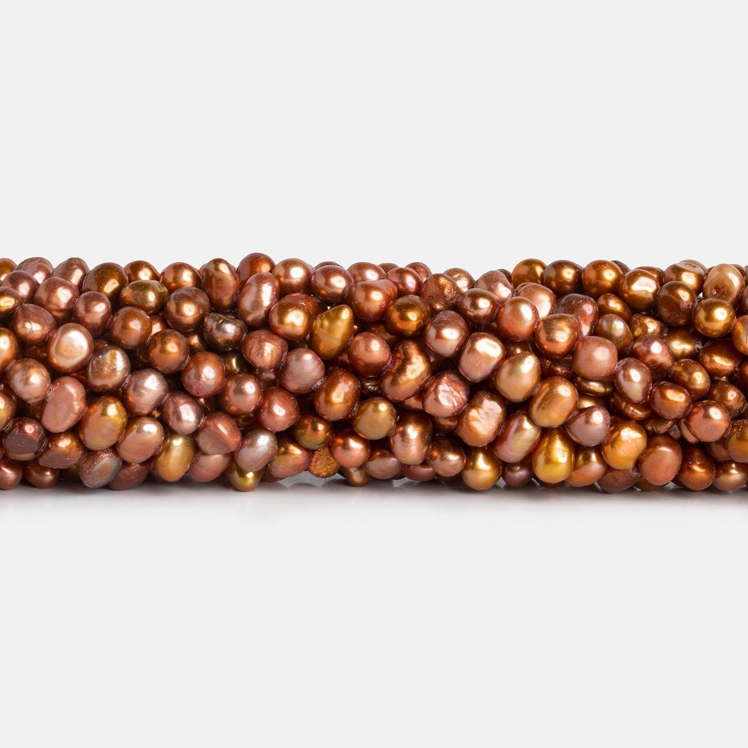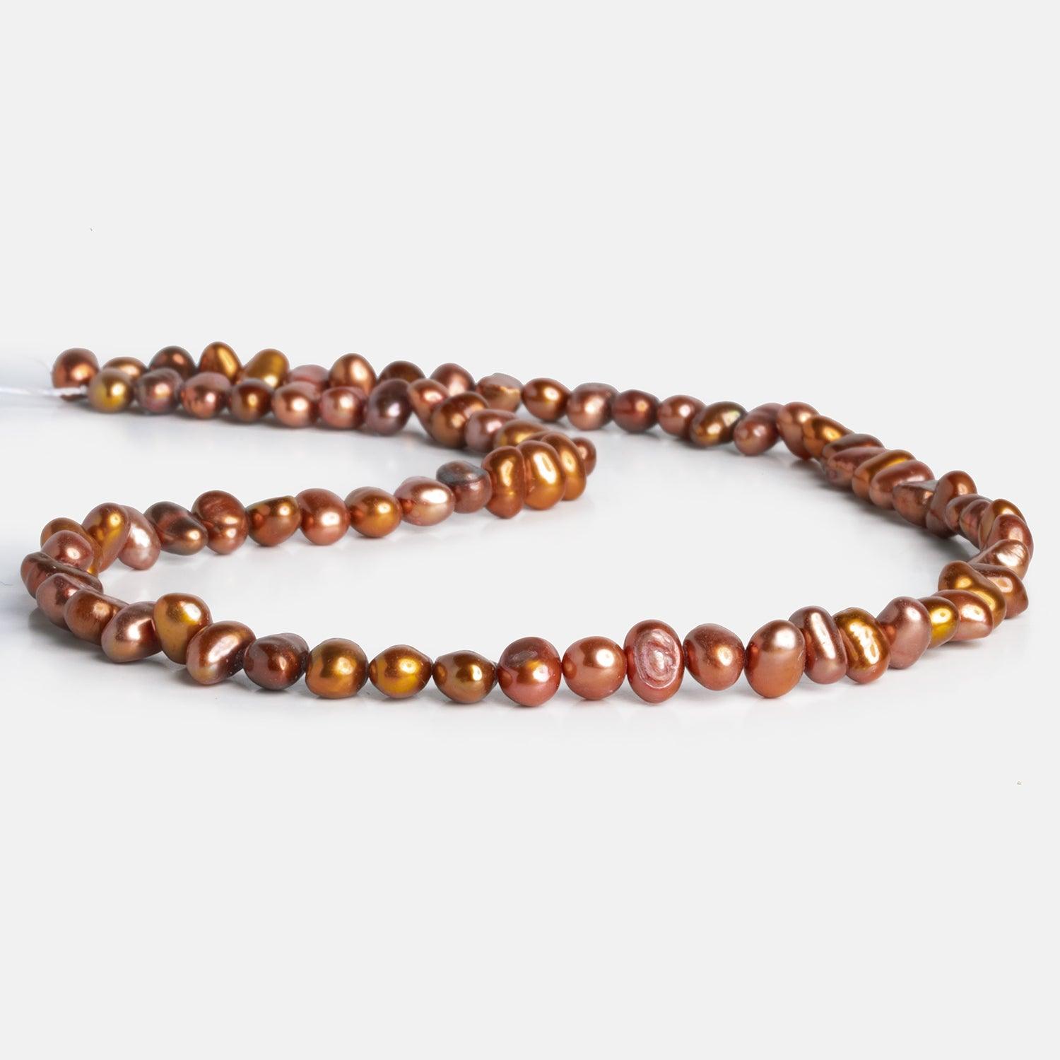 These Freshwater Baroque pearls average 6x5mm with some minor variation of about 1mm. These beautiful beads show off a unique color palette of brassy, blush & brown hues.