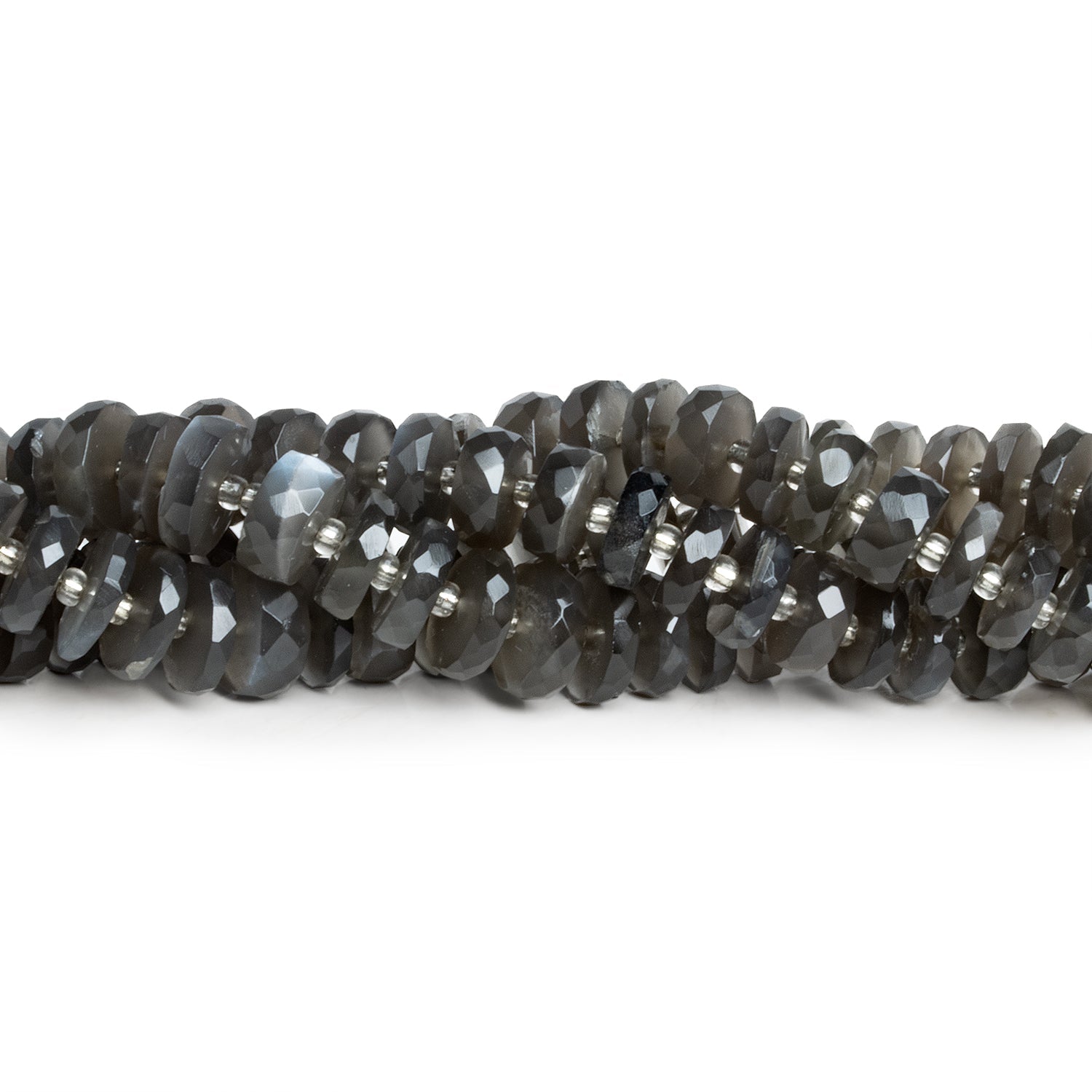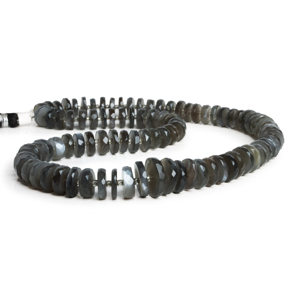 Beads measure 7mm to 13mm in diameter. These curated strands feature a sharp-edged rondelle shape similar to a heishi. Expect a platinum grey color palette throughout with beads displaying a strong and broad Moonstone flash. Fans of this popular high-grade gemstone will love these beads for their sleek, thin shape and alluring appearance. Perfect your Jewelry Design repertoire with these excellent Moonstone pieces destined to imbue bracelets, earrings and necklaces with the gemstones' storied mystique.