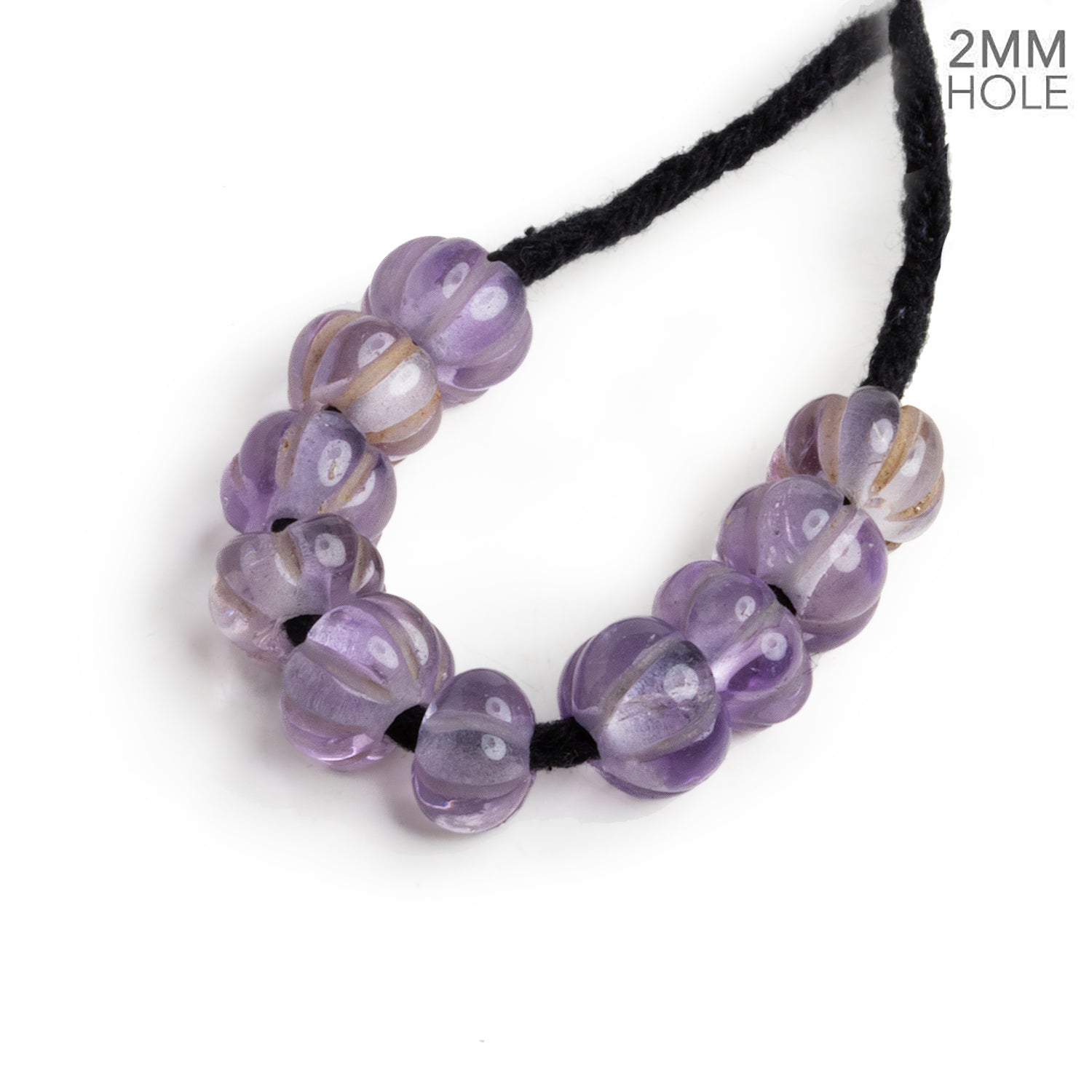 Beads measure about 7mm to 9mm with a 2mm large drill hole. These beautiful offerings show off hand carved craftsmanship on lightly colored Amethyst, designed to fit with the widest array of cording medium possible. Our versatile Melons are destined to dazzle in jewelry designs from necklaces to earrings and bracelets. Consider these unique pieces when sitting down to your next slate of creations, perfect for stringing on thick leather, showing off a handmade aesthetic and much more.