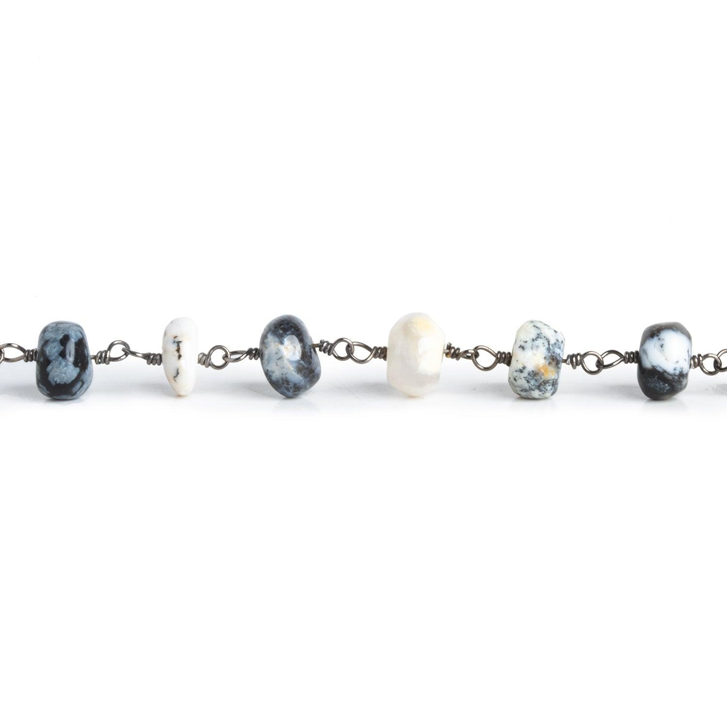 Beads average about 7mm in diameter. This gorgeous handwrapped chain features the sought-after textures as well as black & white color palette of high-quality Dendritic Opal. Expect a curated creation that looks amazing on our signature black gold plated chain. Includes about 30 beads per foot.