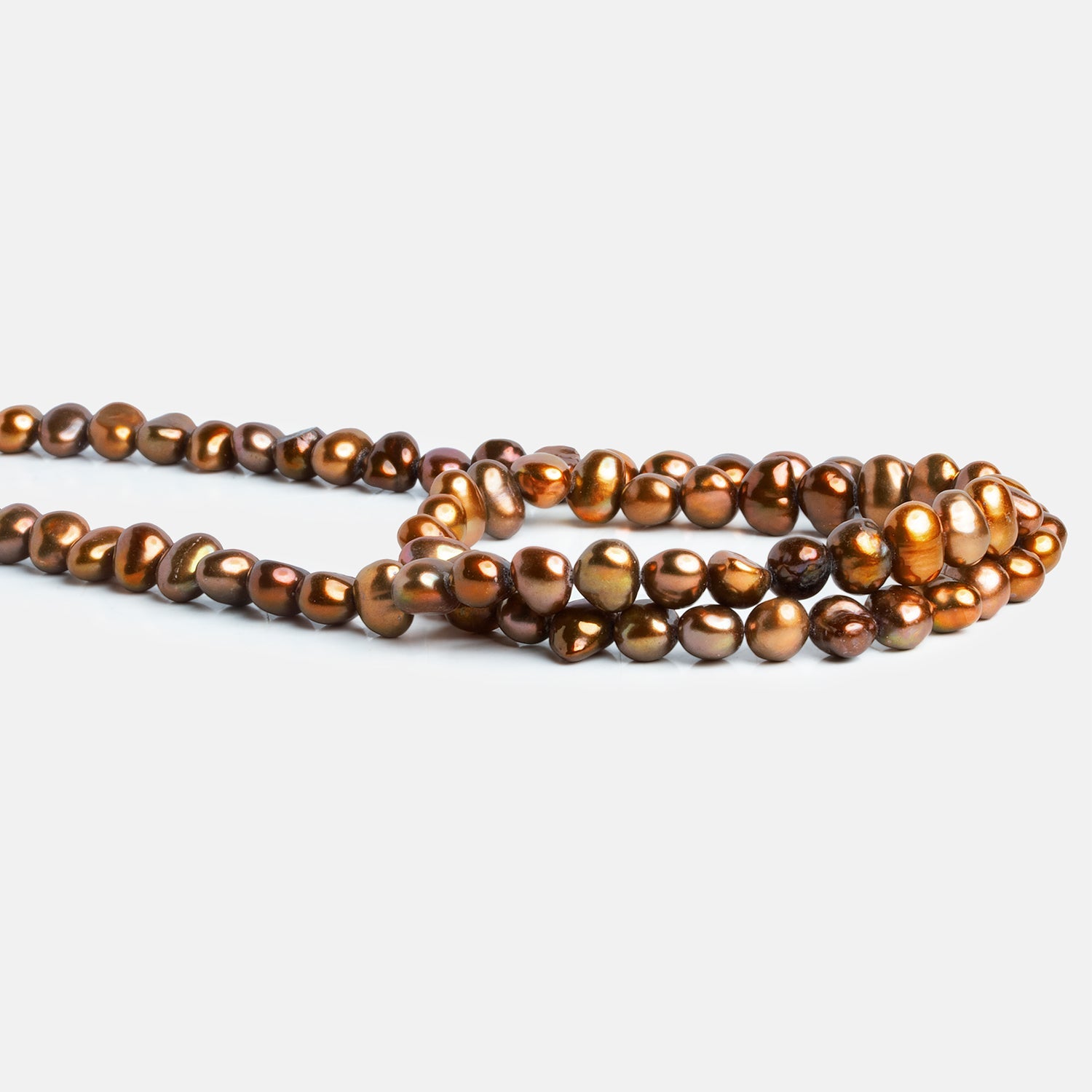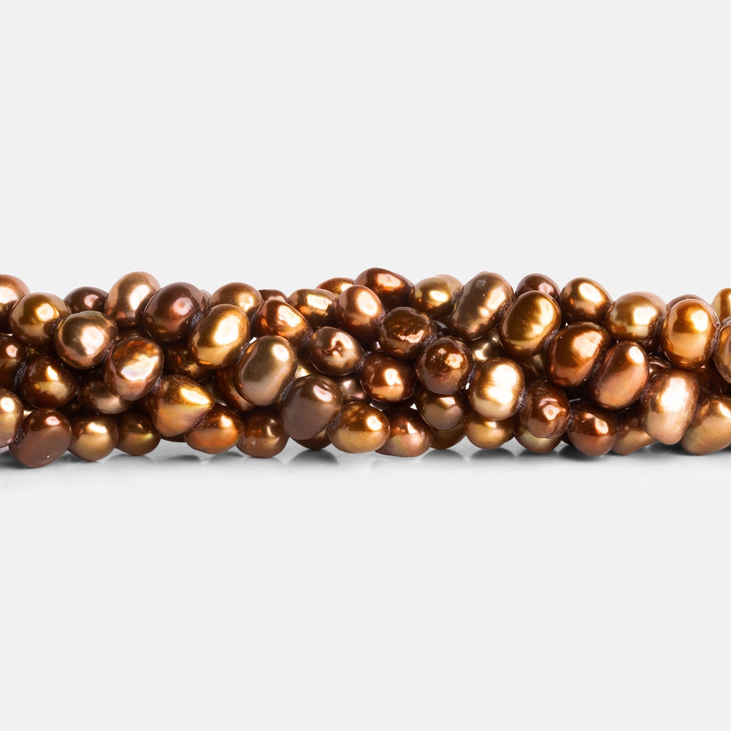Pearls measure about 6x5mm to 7x6mm. Explore the alluring Autumn color palette of our specially curated baroque pearls that carry all the seasonal tones of a smattering of fallen leaves. These exquisite strands feature warm tones with an eye-catching metallic luster capable of starring in all of your most ambitious jewelry designs. Consider these unique options for everything from necklaces and earrings to bracelets and more.
