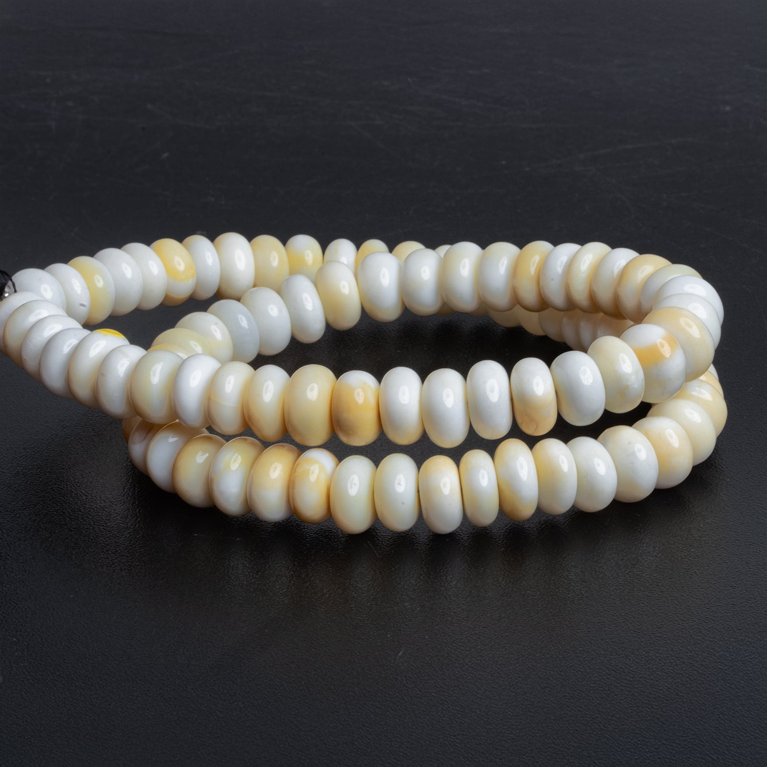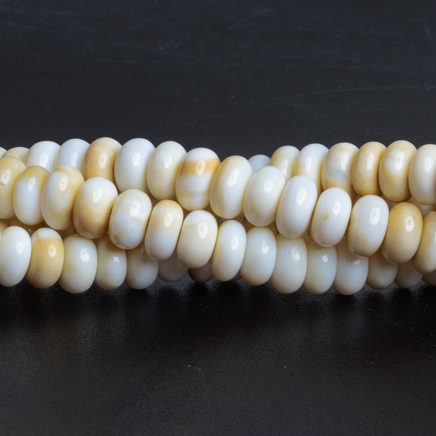 These stunning white opal plain rondelle beads embody a natural elegance with their milky white base subtly accented by warm, golden veining. Their smooth, polished finish highlights the organic beauty of the opal, creating a radiant and refined appearance.