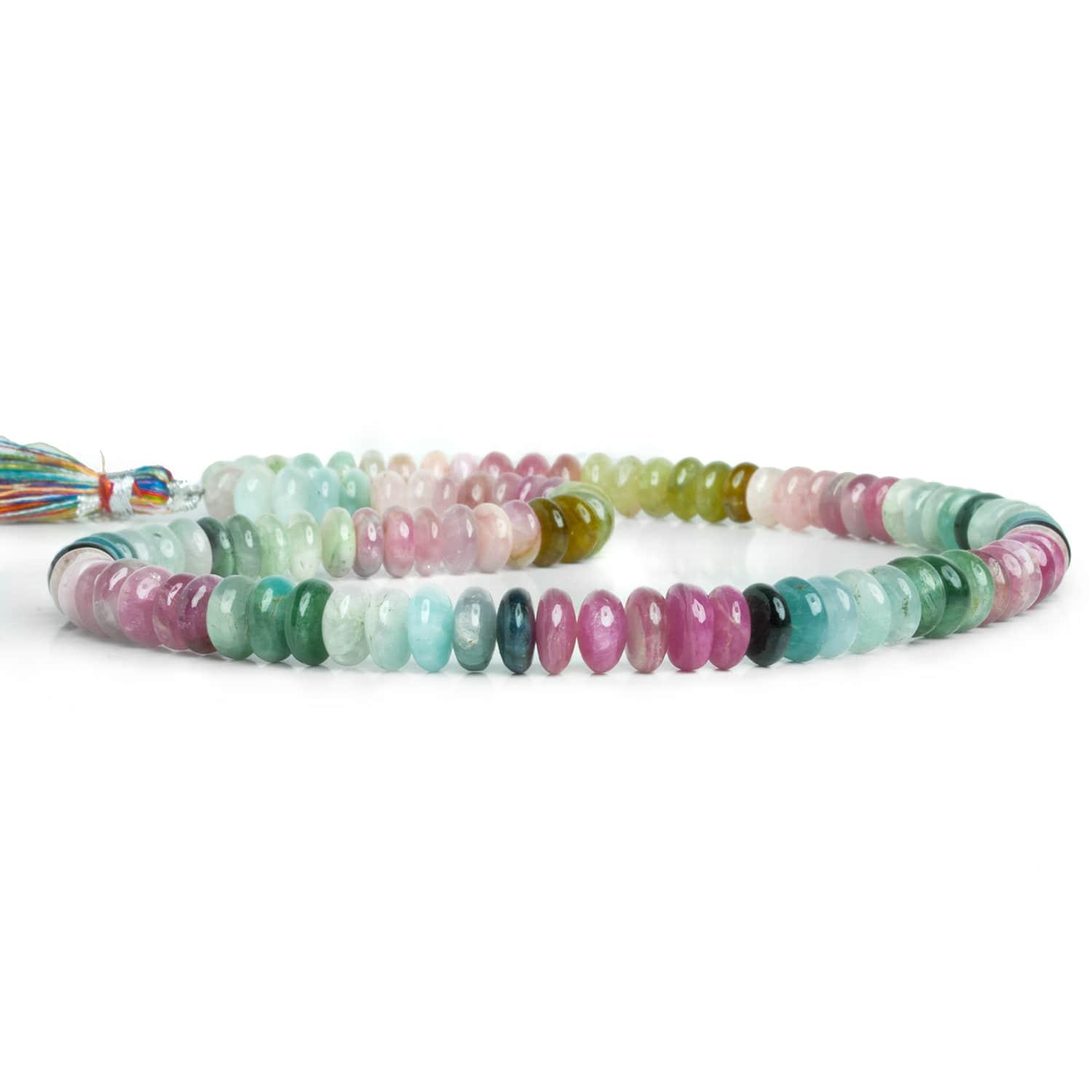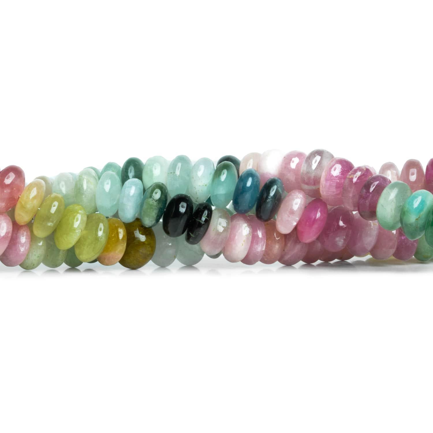 Beads average about 8-8.5mm in diameter. These Multi Color Rondelles have a vitreous luster with a transparent to milky body exhibiting a lovely multi-tonal patterning. Springy greenish blues mingle prominently with pinkish purples and deep yellow in these curated strands of high-grade Tourmaline. Bead size is slightly graduated across the strand, so expect some variation in diameter of about 0.5mm.