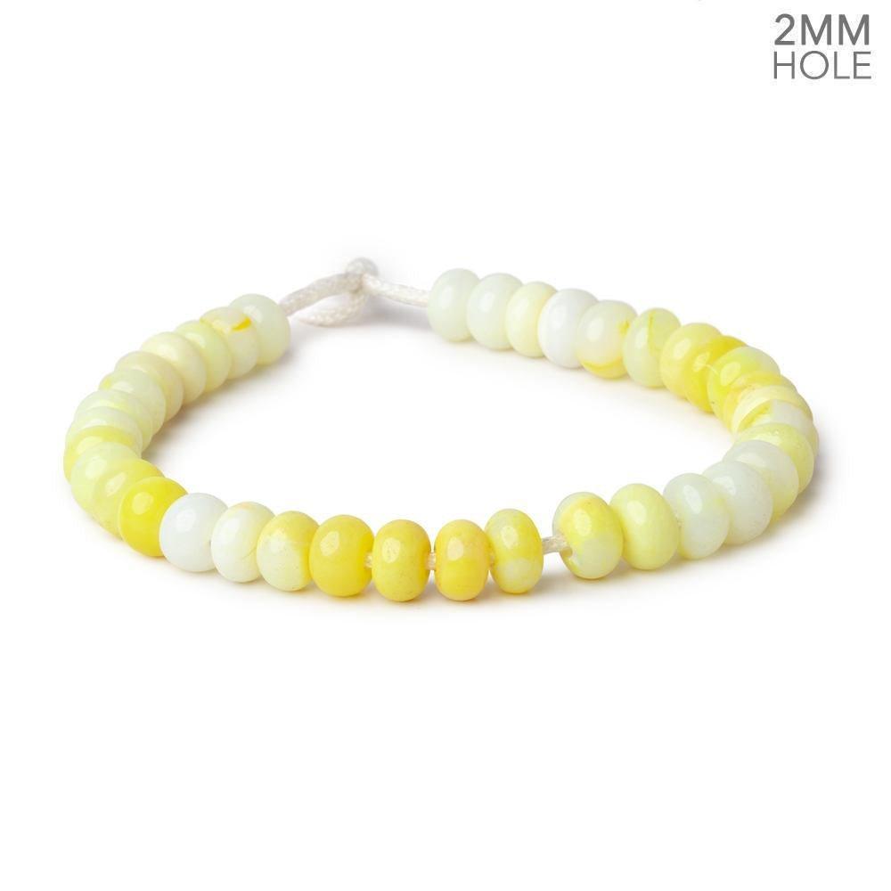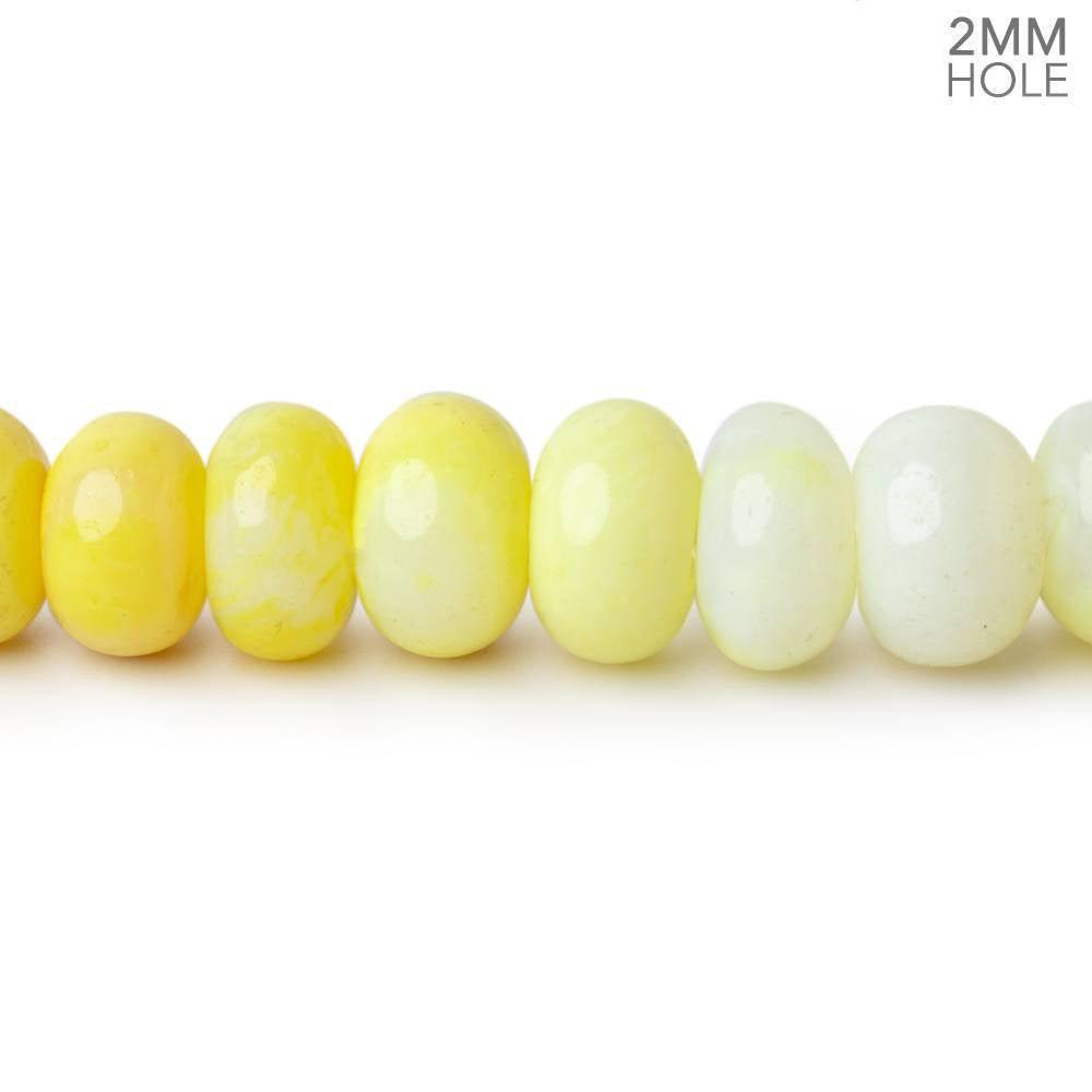 8mm to 9mm Shaded Lemon Yellow Opal unfaceted rondelles have a 2mm inside diameter drill hole with a waxy luster, good polish and a symmetrical shape. These opals are color enhanced common opals with semi opaque bodies. The hues are a range of pale to vibrant lemon yellows.