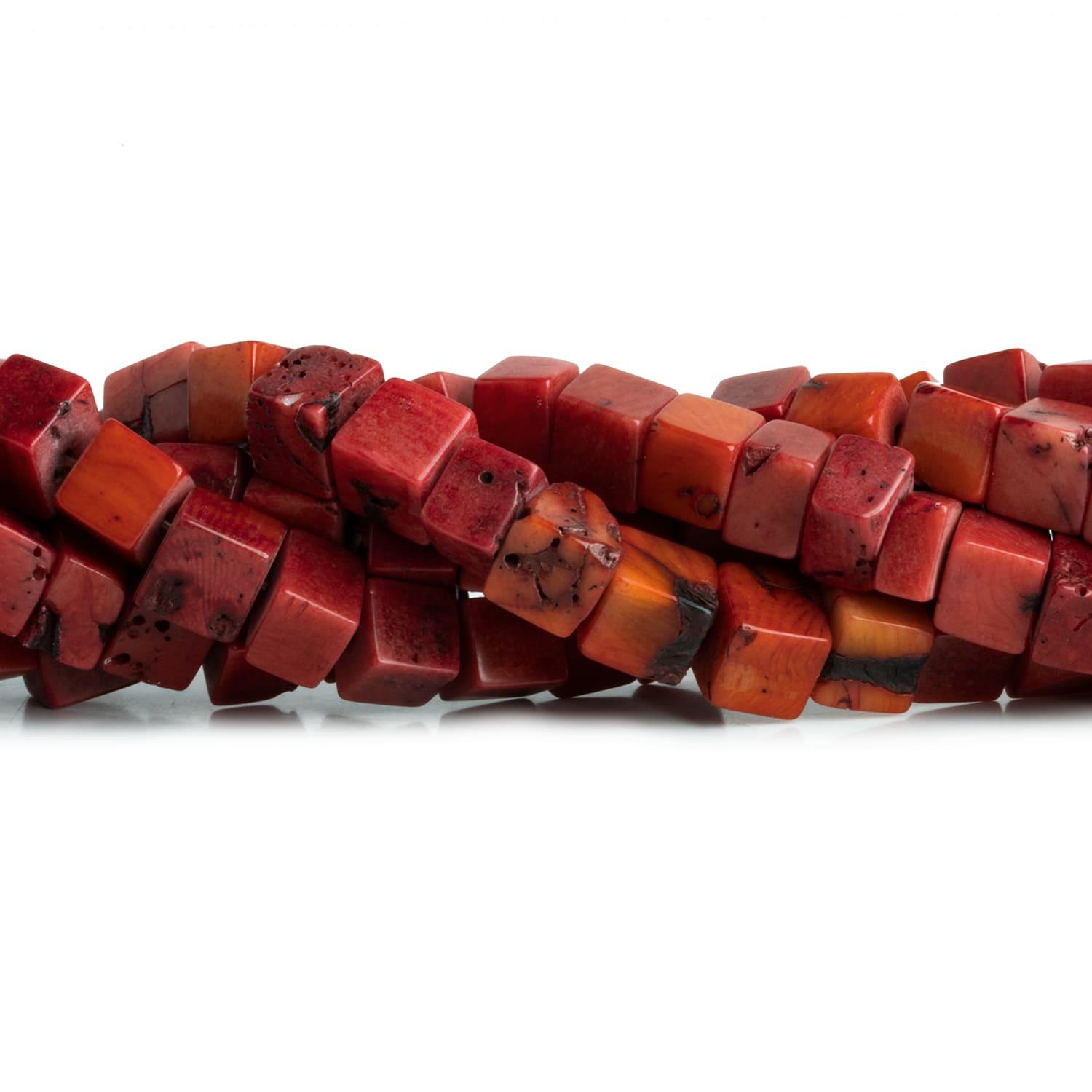 Beads average 8mm to 9mm in diameter. These cubes are crafted from gorgeous red coral full of this material's unique textures. Expect a color palette that ranges from deep red to a burnt orange. Color Enhanced.