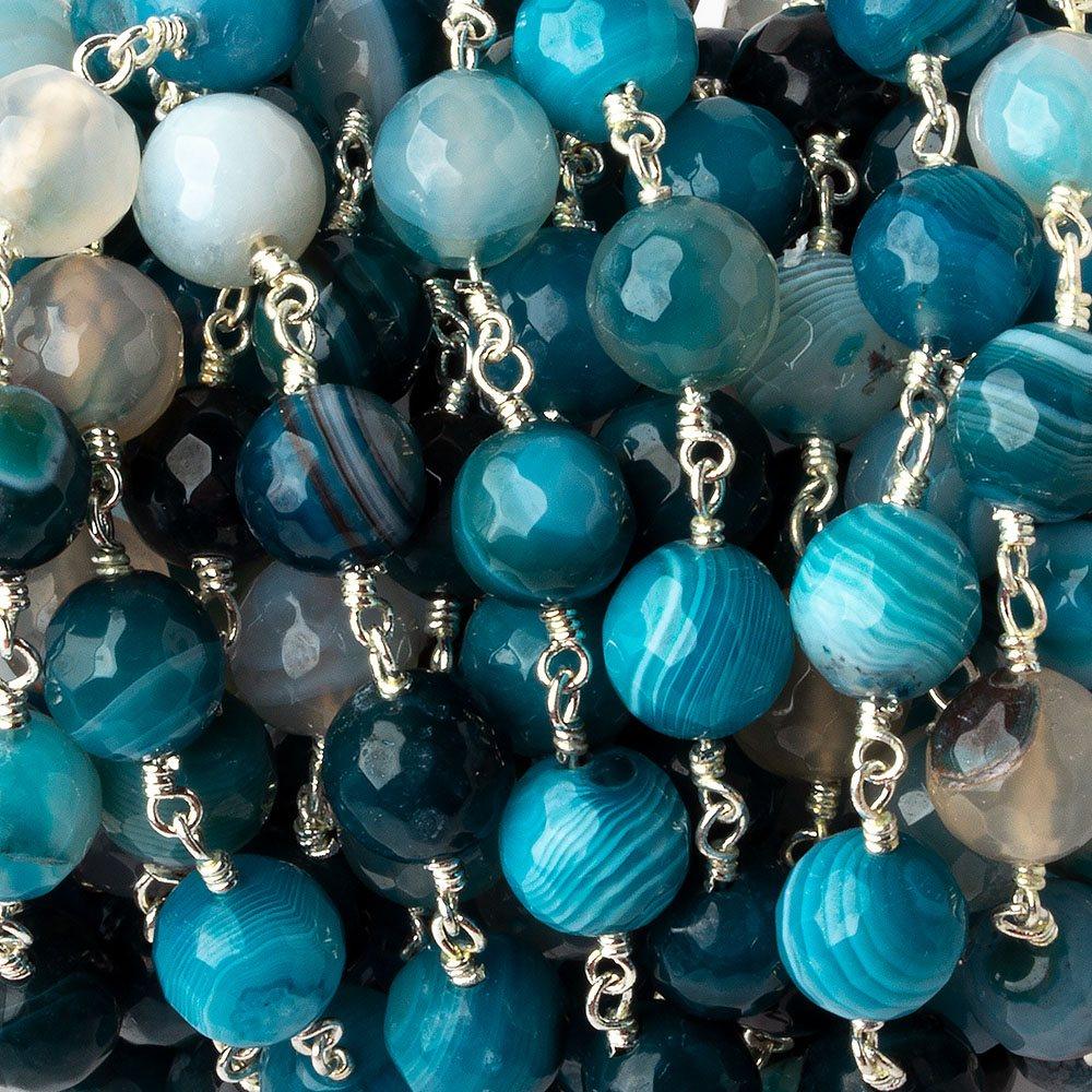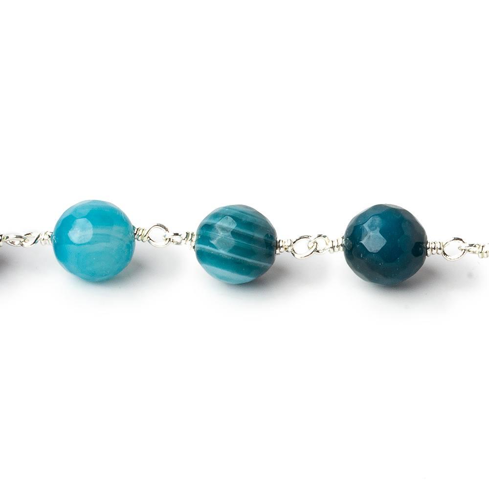 Multi-tonal Blue Banded Agate faceted round Silver plated Chain sold by the foot consisting of 22 beads for each foot measurement. Custom created by hand from our own supply of quality beads to enable matching of these color treated agate 8mm beads.