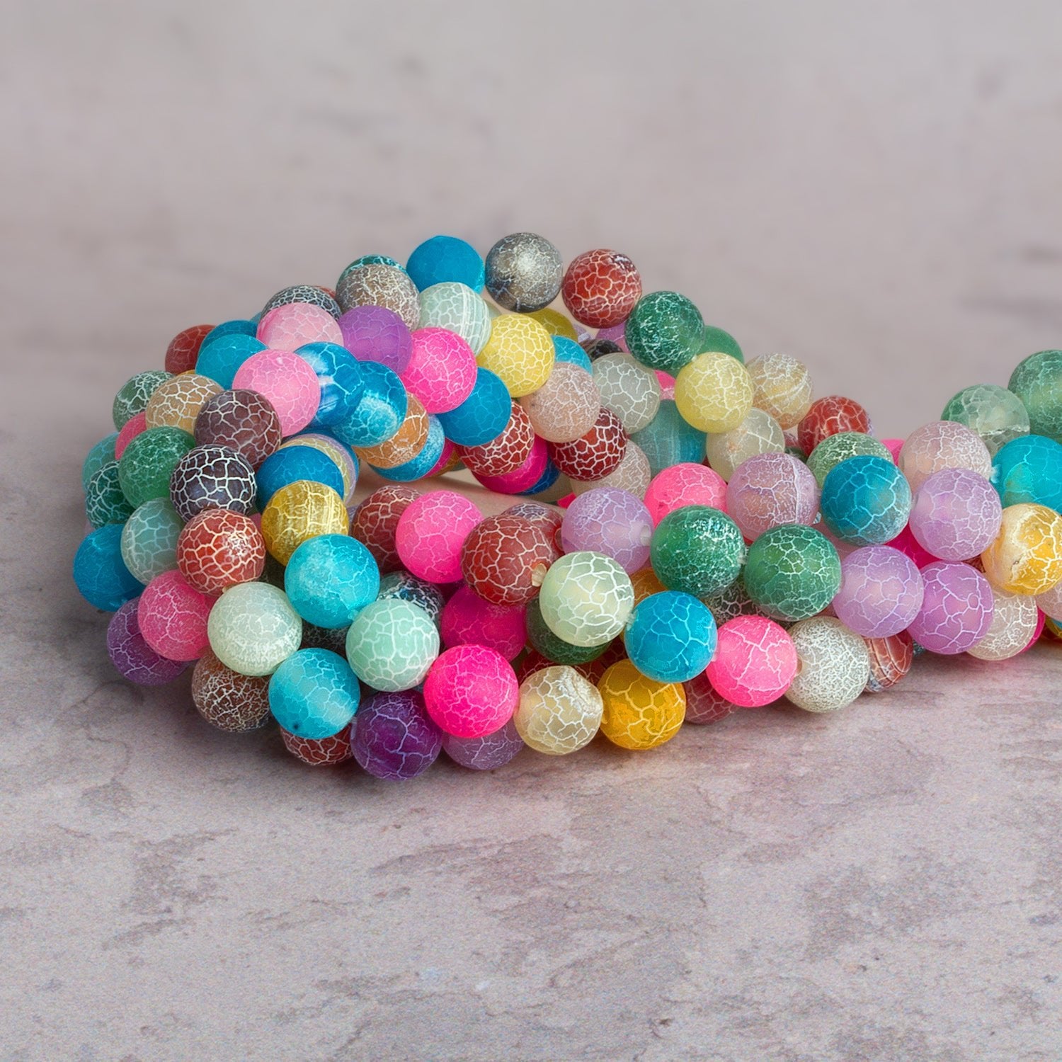 These multicolor matte crackled agate rounds showcase a lively mix of saturated hues—pinks, yellows, greens, blues, and earthy neutrals—each softened by a frosted matte finish. The internal crackle patterning gives every bead a distinctive, stone-like texture, creating visual depth without gloss. Color distribution varies naturally from bead to bead, resulting in strands that feel playful yet organic, with no two sections looking exactly alike.