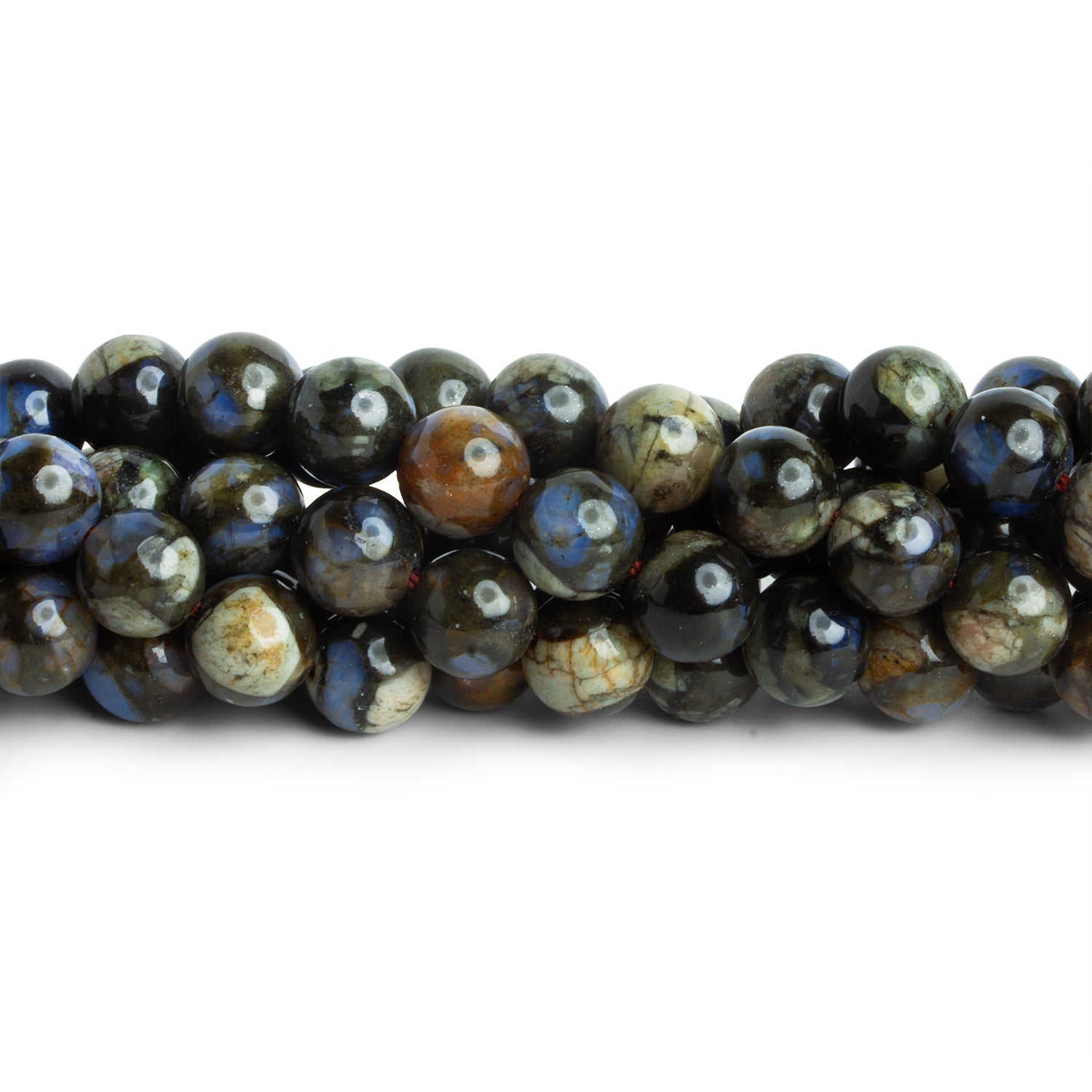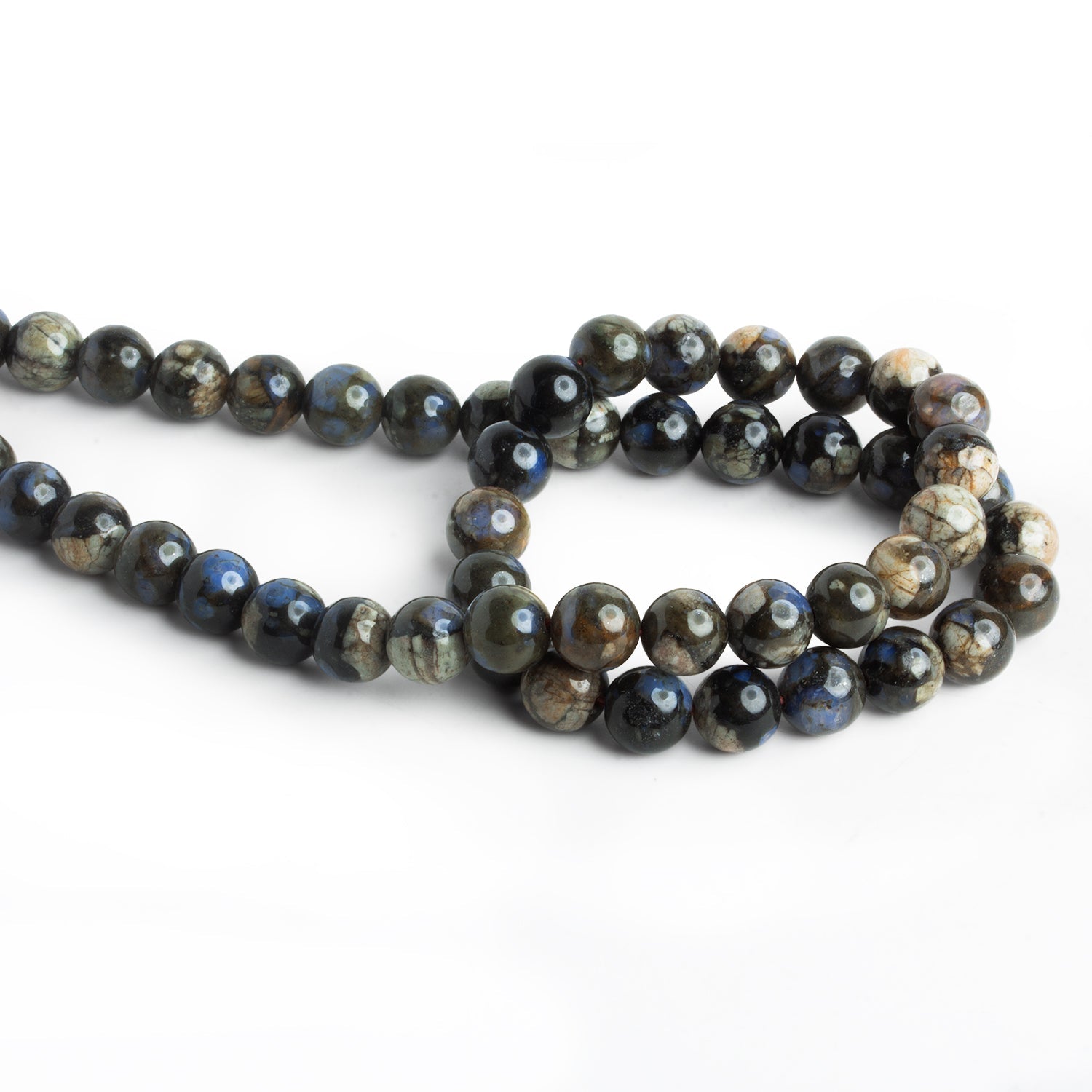 Measuring approximately 8mm in diameter, these smoothly polished round beads showcase rhyolite’s natural beauty with a glossy finish that highlights their complex mineral patterns. Their versatile size makes them ideal for necklaces, bracelets, and malas, pairing especially well with metals, wood, or other earthy gemstones. With their dramatic coloration and geological depth, these rhyolite beads bring a grounded, natural aesthetic to any jewelry design.