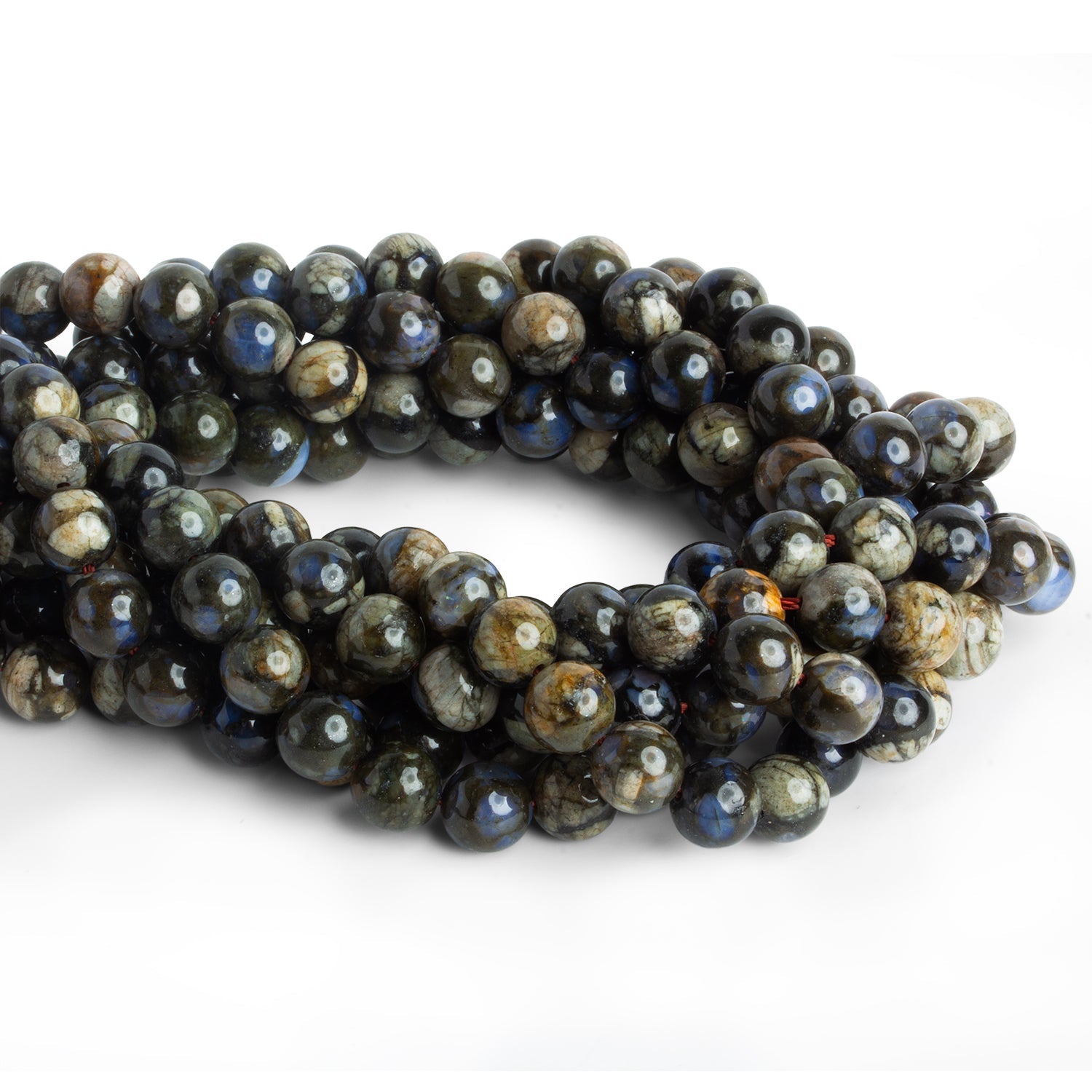 These distinctive rhyolite beads display a rich tapestry of natural patterns and earthy tones. Shades of deep forest green, charcoal, moss, and warm brown intermingle with lighter mineral veining, creating intricate landscapes within each bead. The subtle variations in color and pattern ensure that every bead is unique, giving the strand a beautifully organic character that feels both rugged and refined.