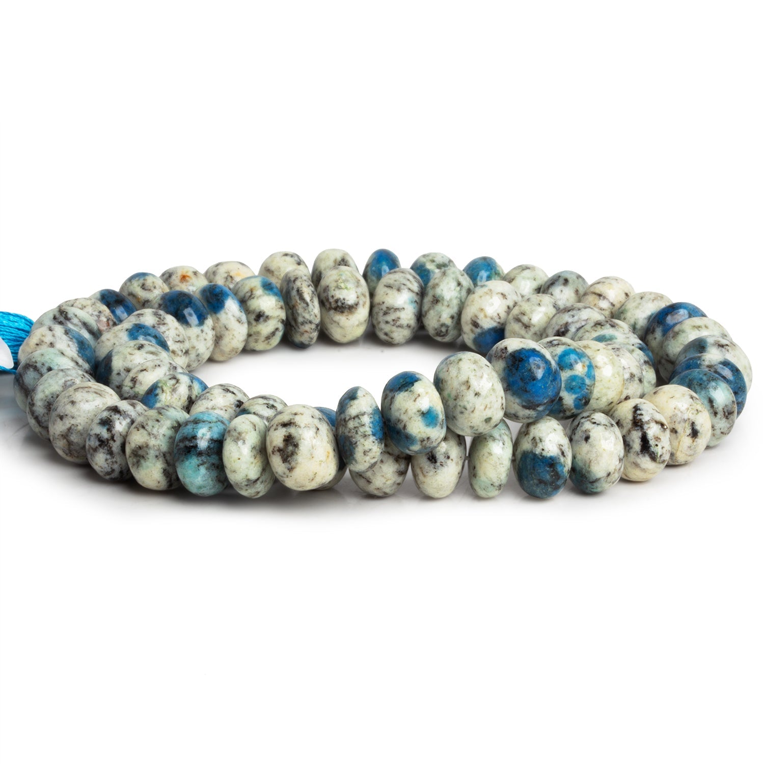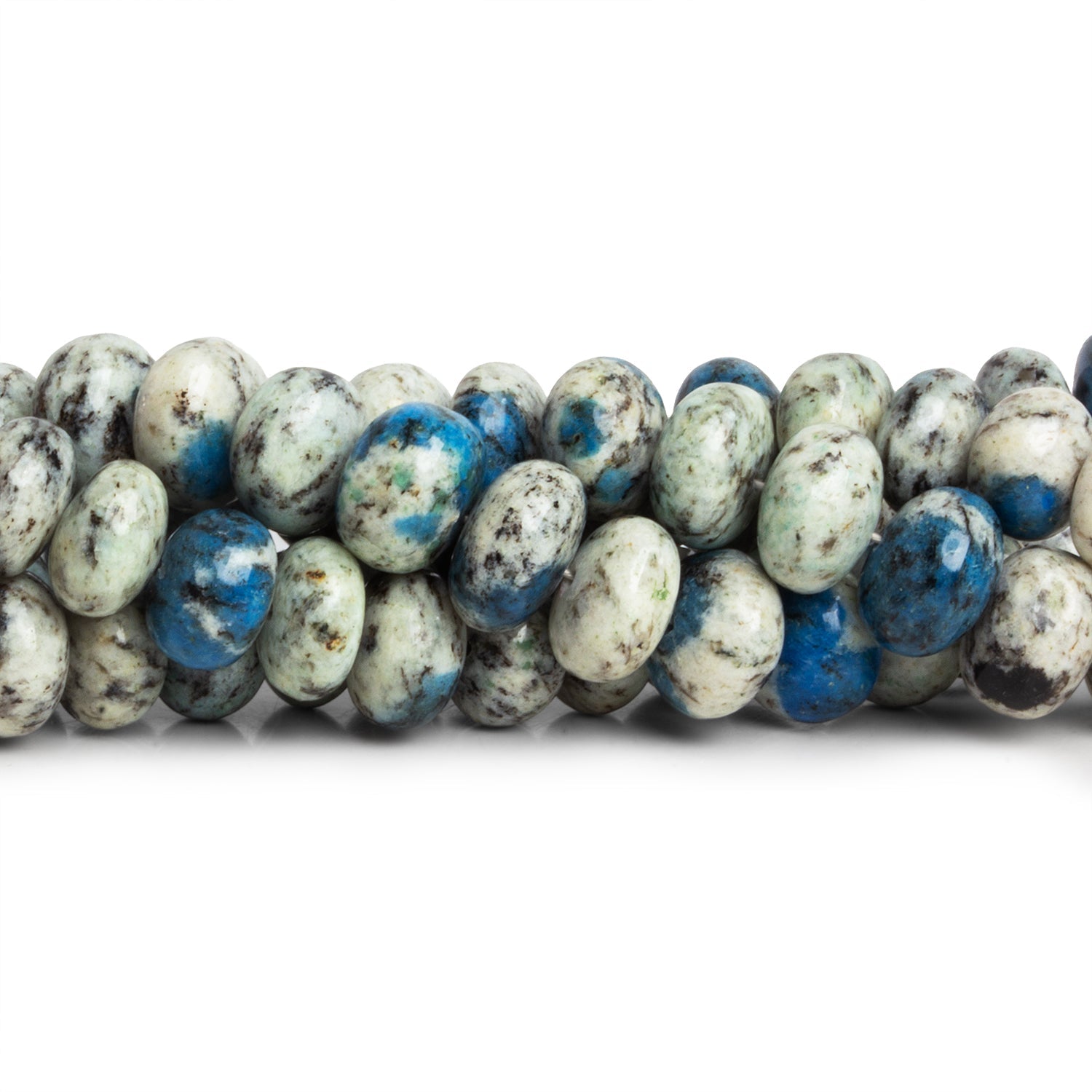 K2 Azurite Granite rondelle beads offer a striking blend of crisp alpine granite tones and vivid azurite orbs in every piece. Often called K2 Jasper, this rare stone is quarried high in Pakistan’s Karakoram range near the base of the world-famous K2 peak. The pale, speckled granite matrix is naturally studded with bright cobalt-blue azurite, creating a pattern that looks almost hand-painted. Cut into smooth plain rondelles, these beads slide beautifully on cord and space neatly between focal elements while still providing plenty of visual impact.